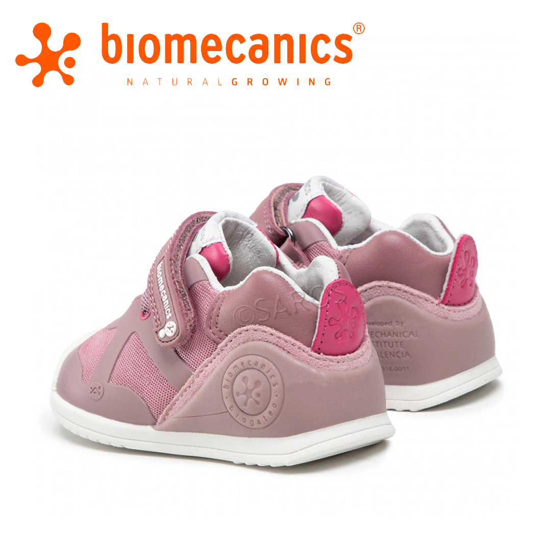 Sapatos Biomecanics 191168, em rosa, que protegem os pés das crianças e respeitam o seu crescimento natural. Parte superior têxtil e interior de pele. Estabilizador macio: solta o tornozelo e protege o pé. Palmilha de couro antibacteriana removível. Biqueira reforçada.