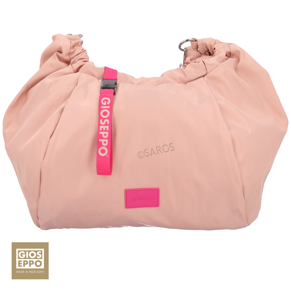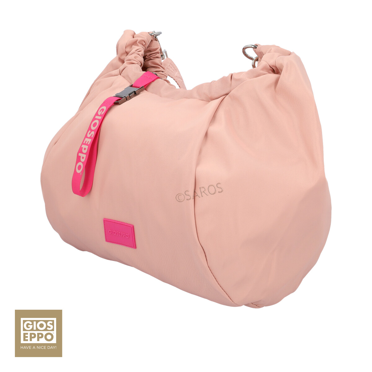 Bolsa grande da Gioseppo em rosa, fabricada com poliéster reciclado. Bolsa com bastante espaço e uma alça ajustável preenchida com o logotipo estampado.