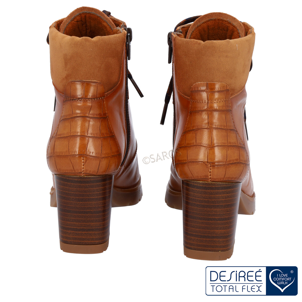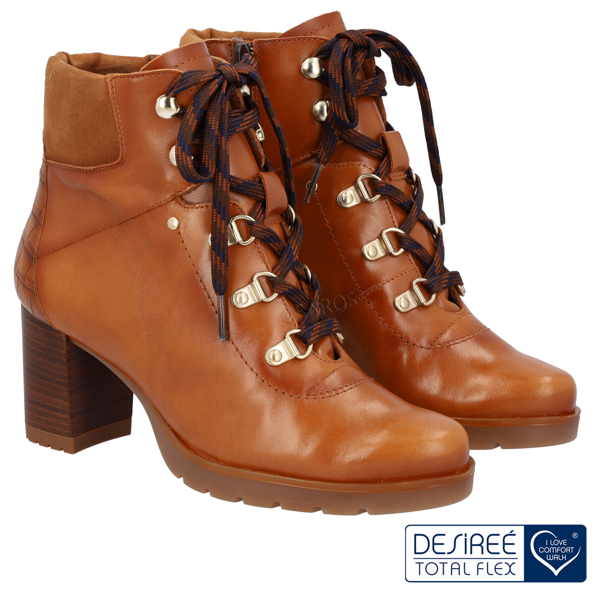 Botim Desireé de cordão para Mulher, extra macios e confortáveis. Modelo em pele nos tons de camel com cordões castanhos e um tacão largo de 6.5 cm de altura. A sola de borracha oferece um melhor conforto para o dia a dia .