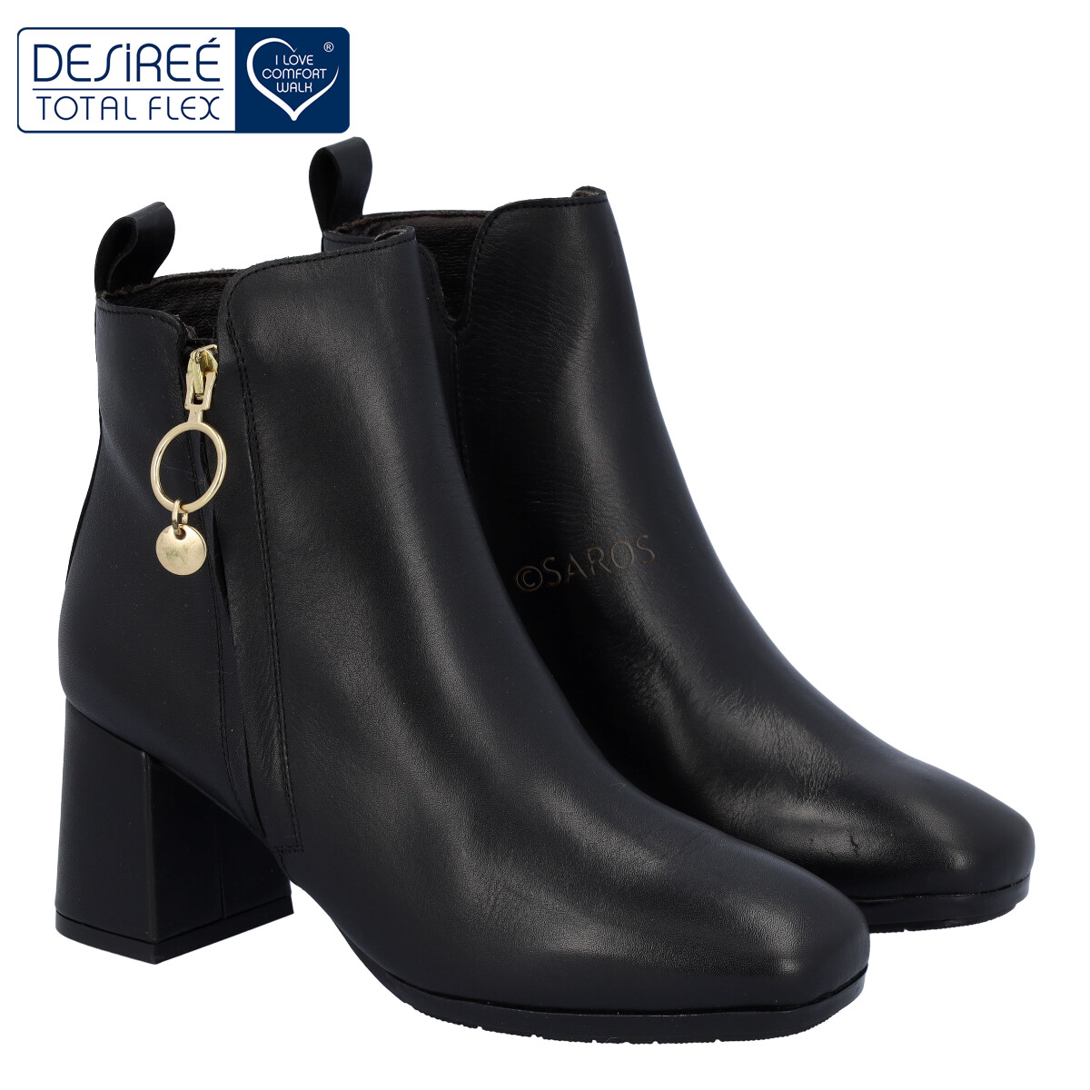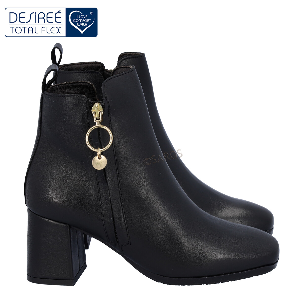 Botim Desireé em pele macia em preto, com tacão de 6cm. O salto largo e a sola antiderrapante de borracha garantem grande conforto. Para facilitar, o botim tem um fecho de correr na parte lateral no exterior da bota. Um verdadeiro moderno que vais querer ter no teu armário.