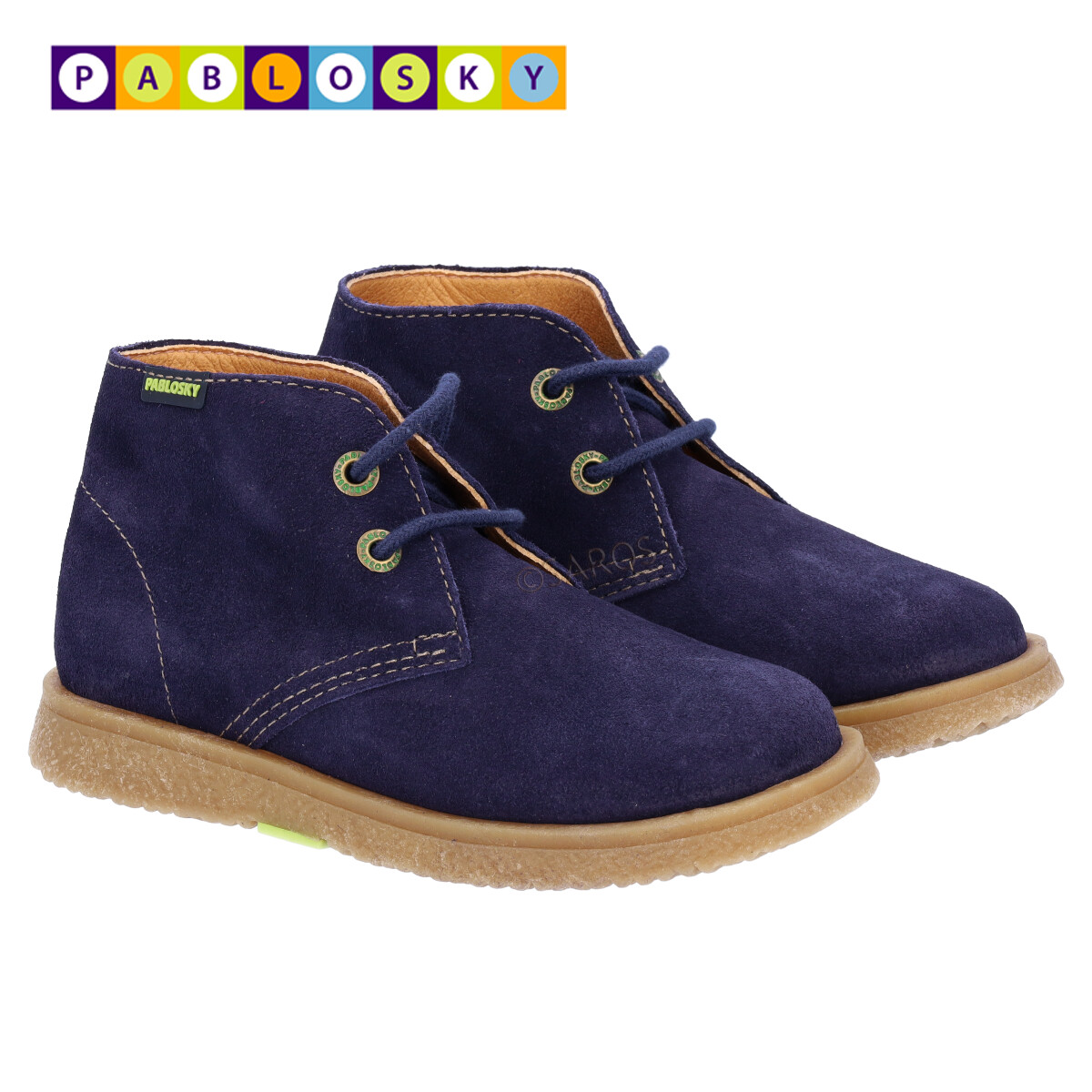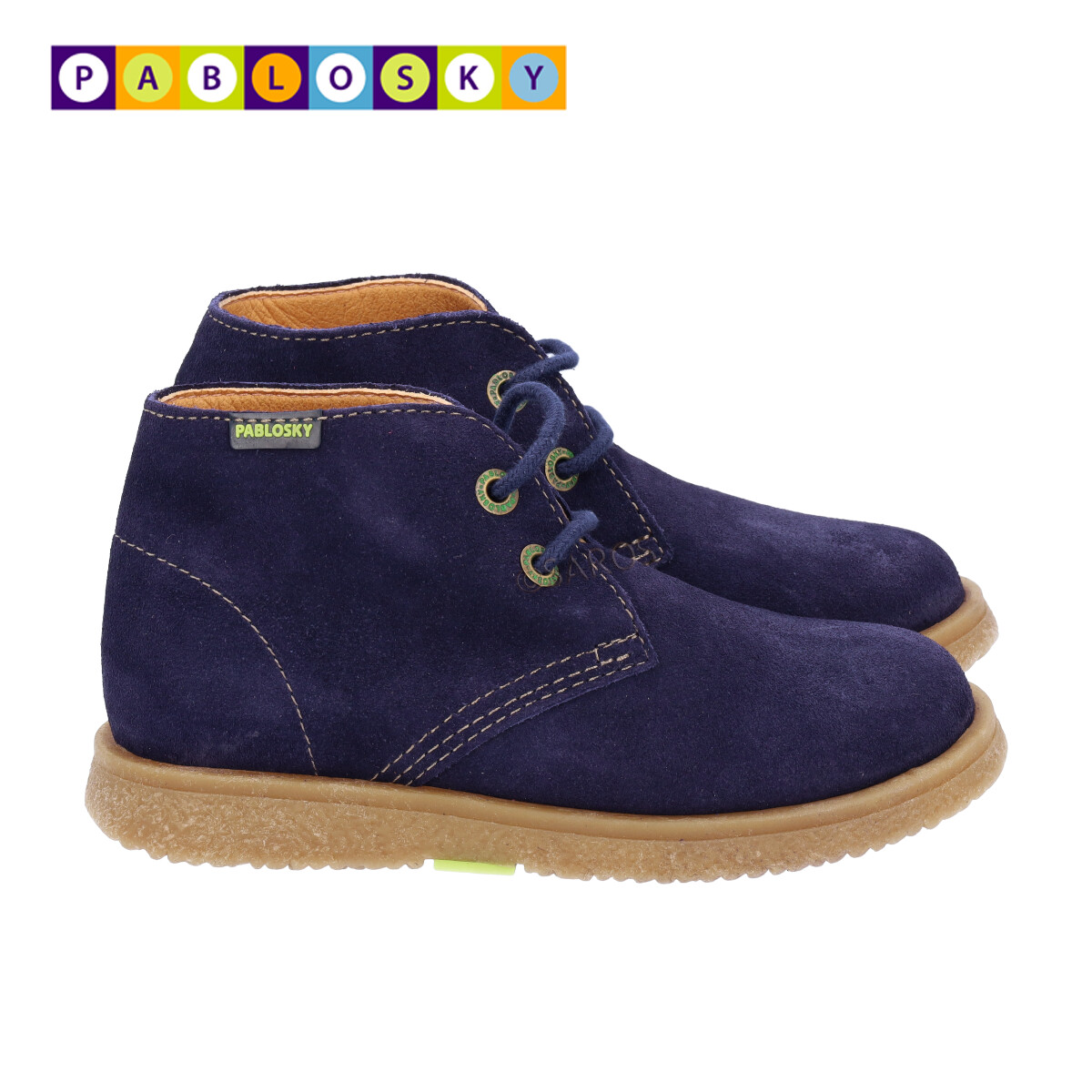 Botim de menino Pablosky com cordões, em camurça azul. Forma fisiológica para o correto desenvolvimento do pé. - Forro sem costuras - Palmilha de amortecimento - Sola de borracha antiderrapante e de alta resistência, que favorece a flexão normal do pé - Protetores internos de calcanhar.