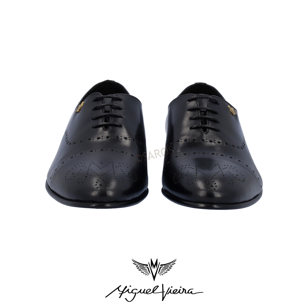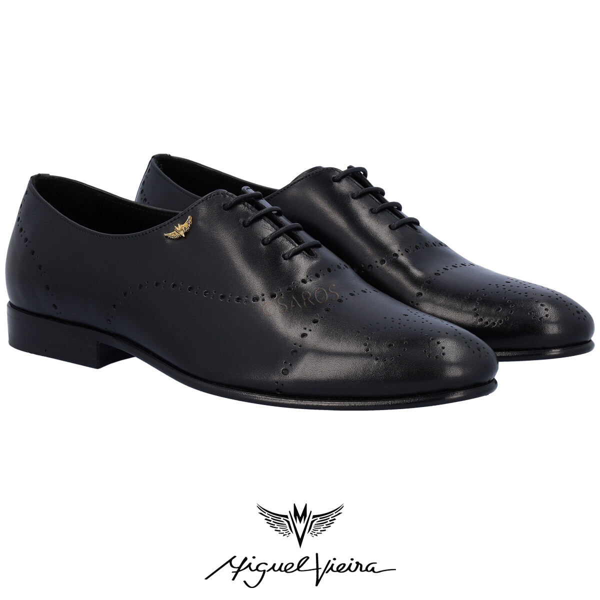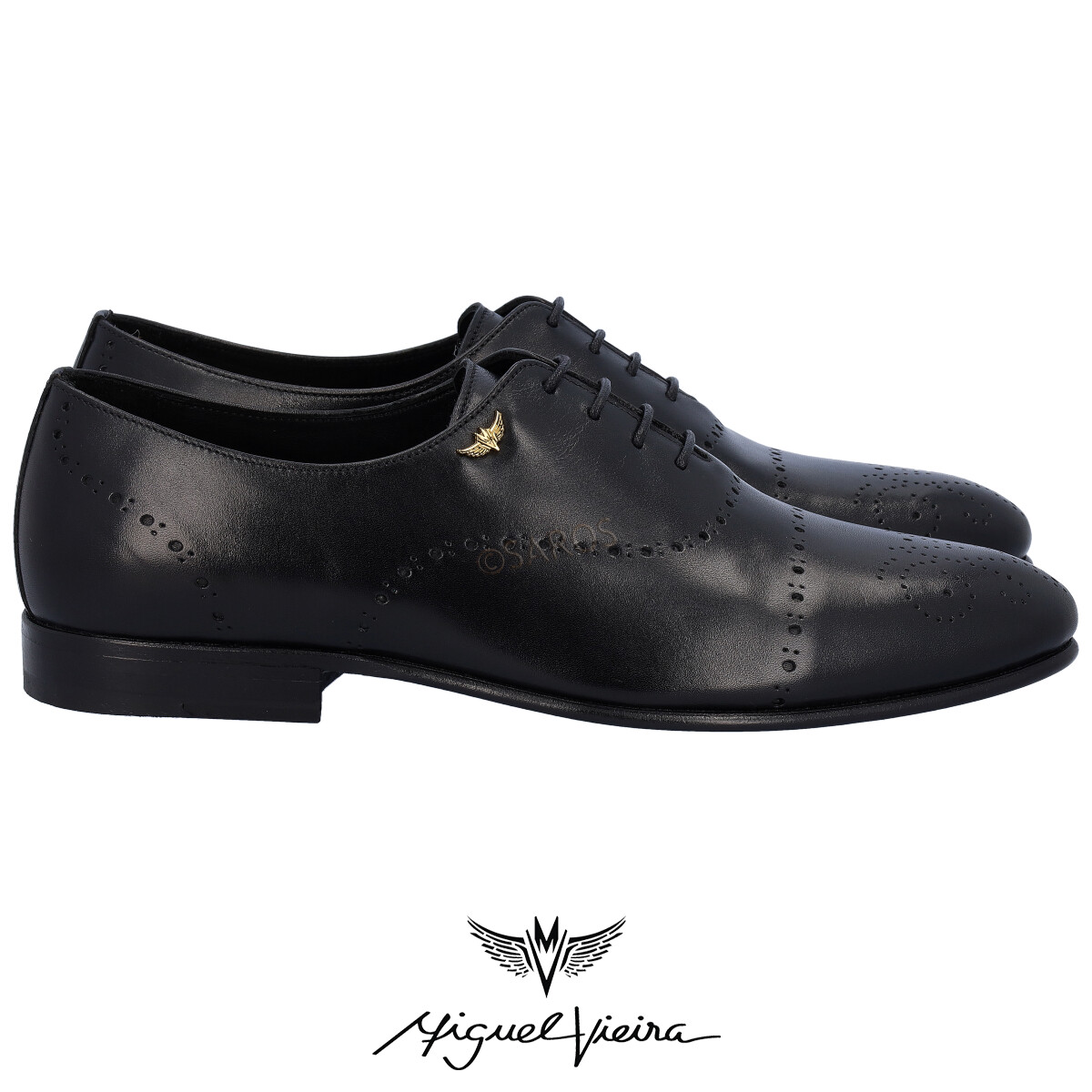 Sapatos para o Homem de Miguel Vieira, modelo Mv10007 no tom de Preto. Sapato clássico em pele  e sola de couro, recheado de detalhes pensados ao pormenor. Contém uma aplicação metálica em dourado, do logotipo da marca, e na zona superior temos elaborado  “MV” de Miguel Vieira .