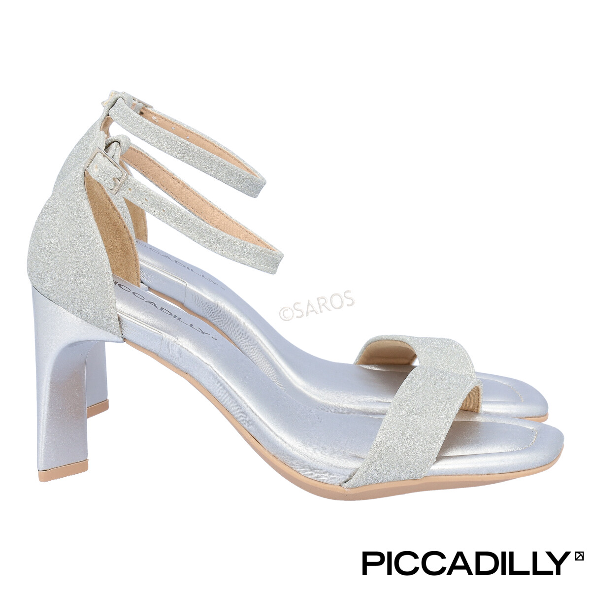 Sandálias Piccadilly em prateado com brilhos / glitter. A tira fina torna este modelo muito elegante, perfeito para cerimónia ou festa. Sandálias de salto alto (8cm) e ligeiramente largo, que lhe dará muita estabilidade ao andar. Os calçados Piccadilly têm o "Calce Perfeito": conjunto de benefícios exclusivos que respeita a anatomia do pé e diminui o cansaço.