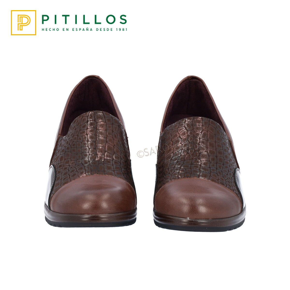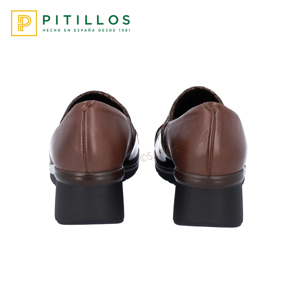 Sapato de mulher Pitillos Castanho de cunha média (aproximadamente 2 cm de altura), em pele. Contém ainda material elástico no peito do pé conferindo um melhor ajuste ao pé. Detalhes de grande elegância .