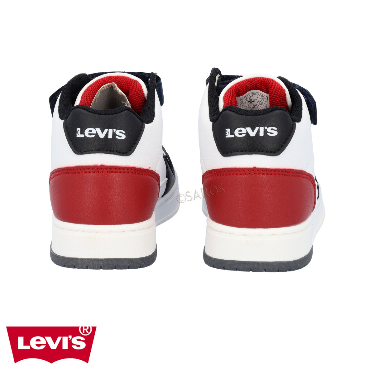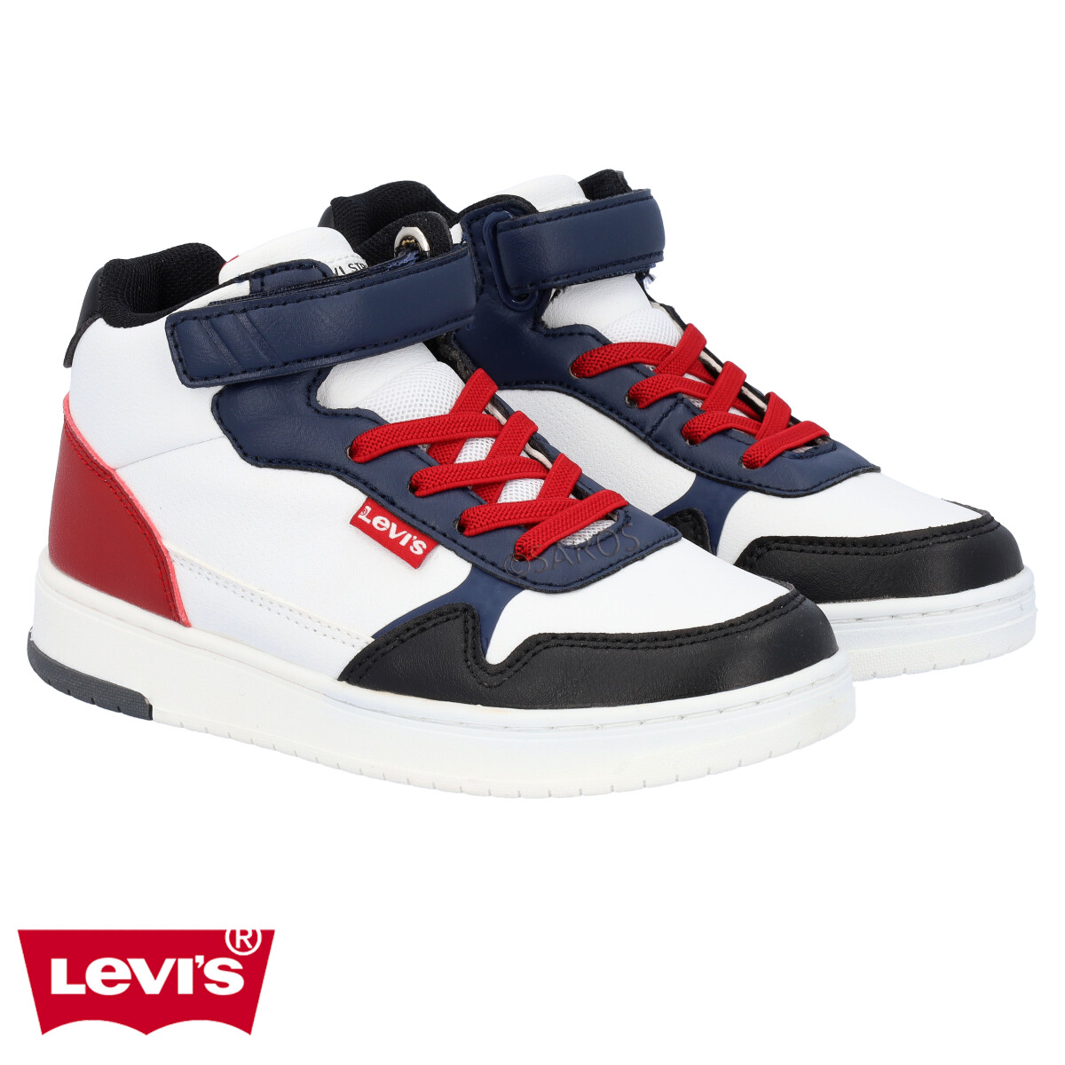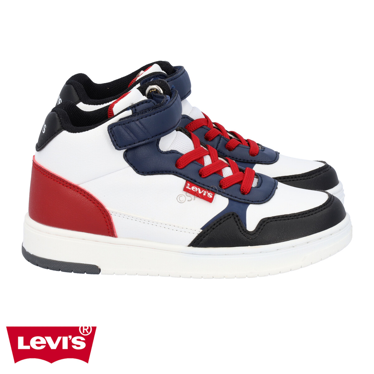 Sapatilha Levi's tipo bota em branco com detalhes em azul e bordô, num modelo com visual urbano e moderno. É muito prático de calçar, com cordões elásticos e tira de velcro.