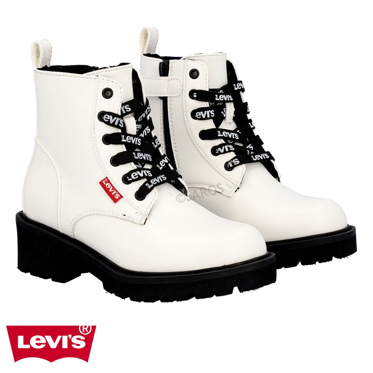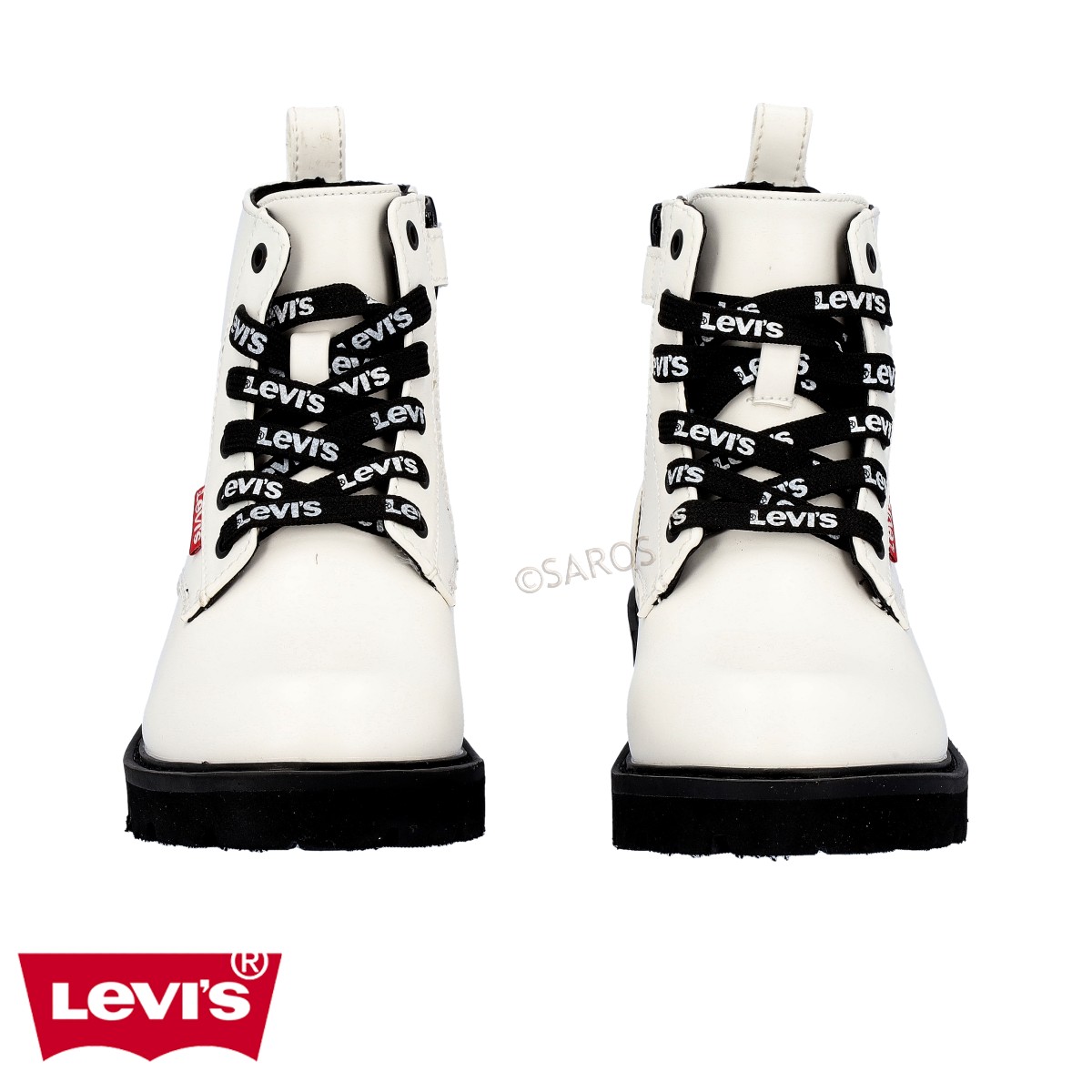Botim da Levi's de criança no tom de Branco com cordões personalizados. Botim de estilo “bota militar”, com o interior de matérias em tecido com camada extra para uma melhor proteção para os dias mais frios.
