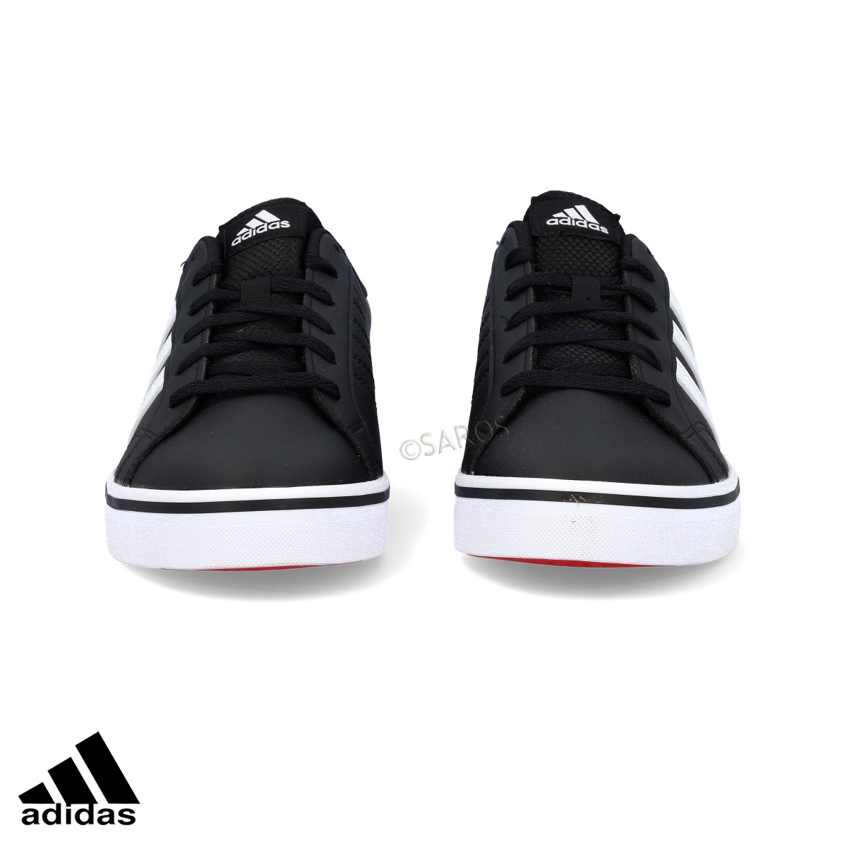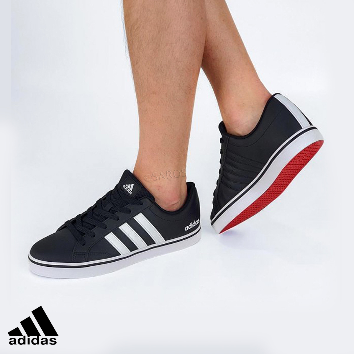 Sapatilha Homem pretas, mais exatamente preto com pormenores em brancos e uma sola vermelha, enquadrada para qualquer estilo masculino.  Sapatilhas adidas de um ótimo conforto.