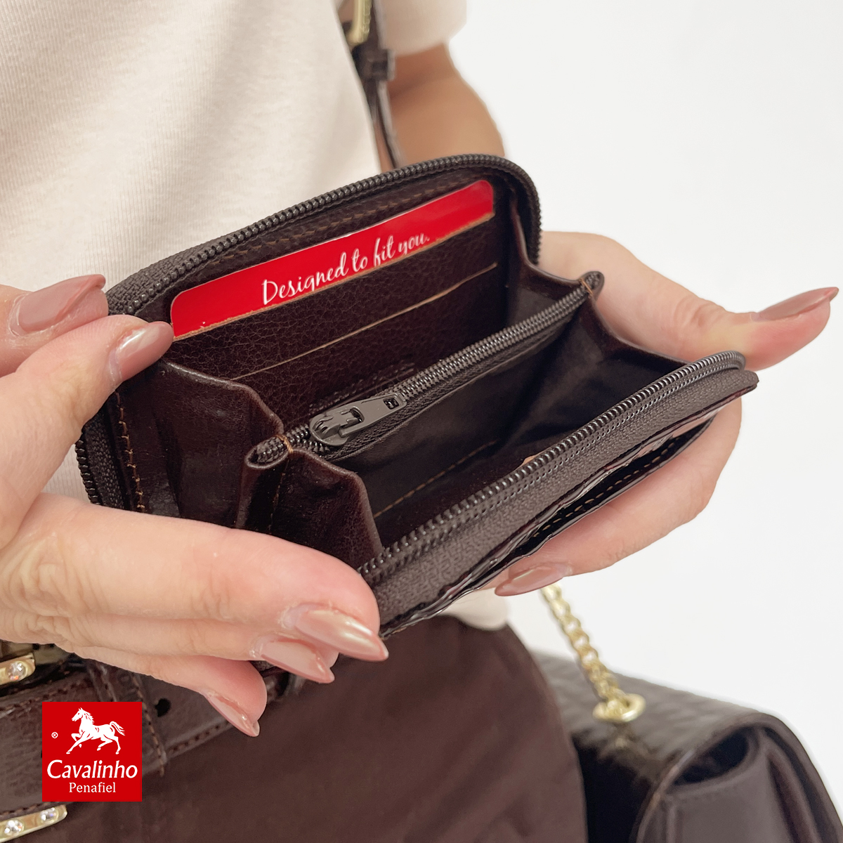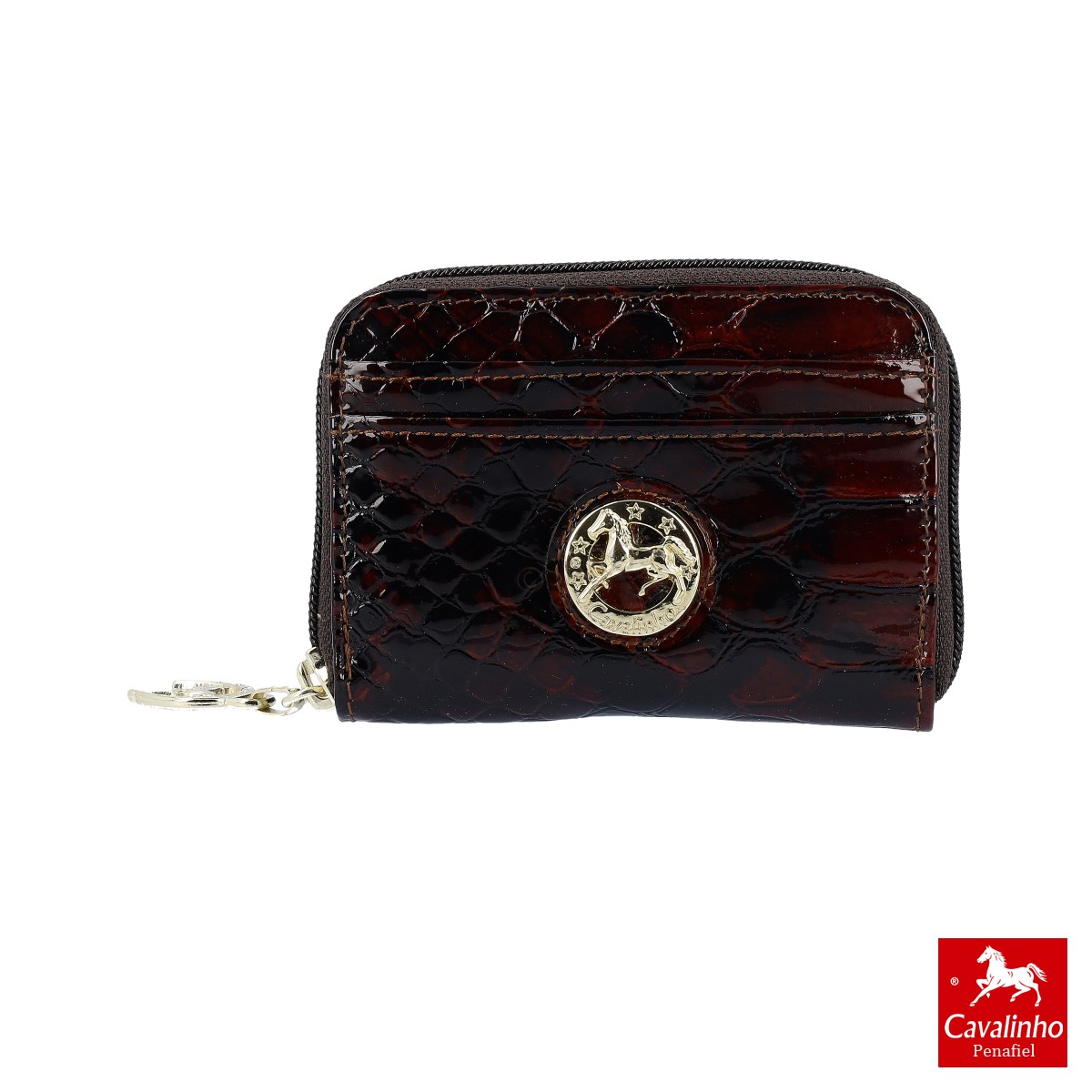 Carteira pequena em castanho da linha Galope de senhora com fecho. Tem 4 espaços para cartões no interior, mais 4 na parte superior e bolsa interior com fecho para moedas.