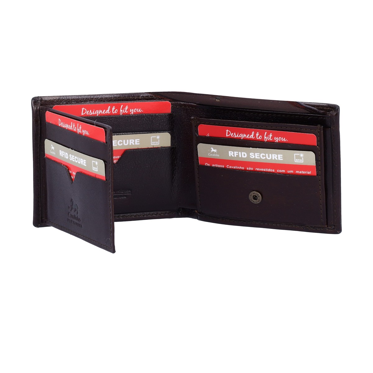 Carteira em pele nos tons de castanho com 9 ranhuras para cartões, 1 mica para fotos, moedeiro com mola e 2 separadores para notas. Com sistema RFID Secure que protege os seus cartões bancários.