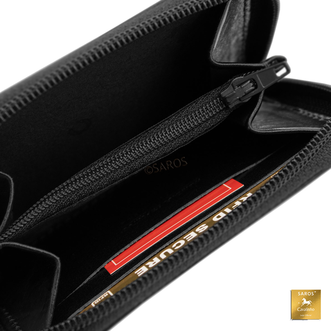 Carteira pequena para Homem, no tom de Preto, com abertura de fecho de correr. Carteira com 1 compartimento para moedas com fecho de correr e capacidades de 4 cartões.