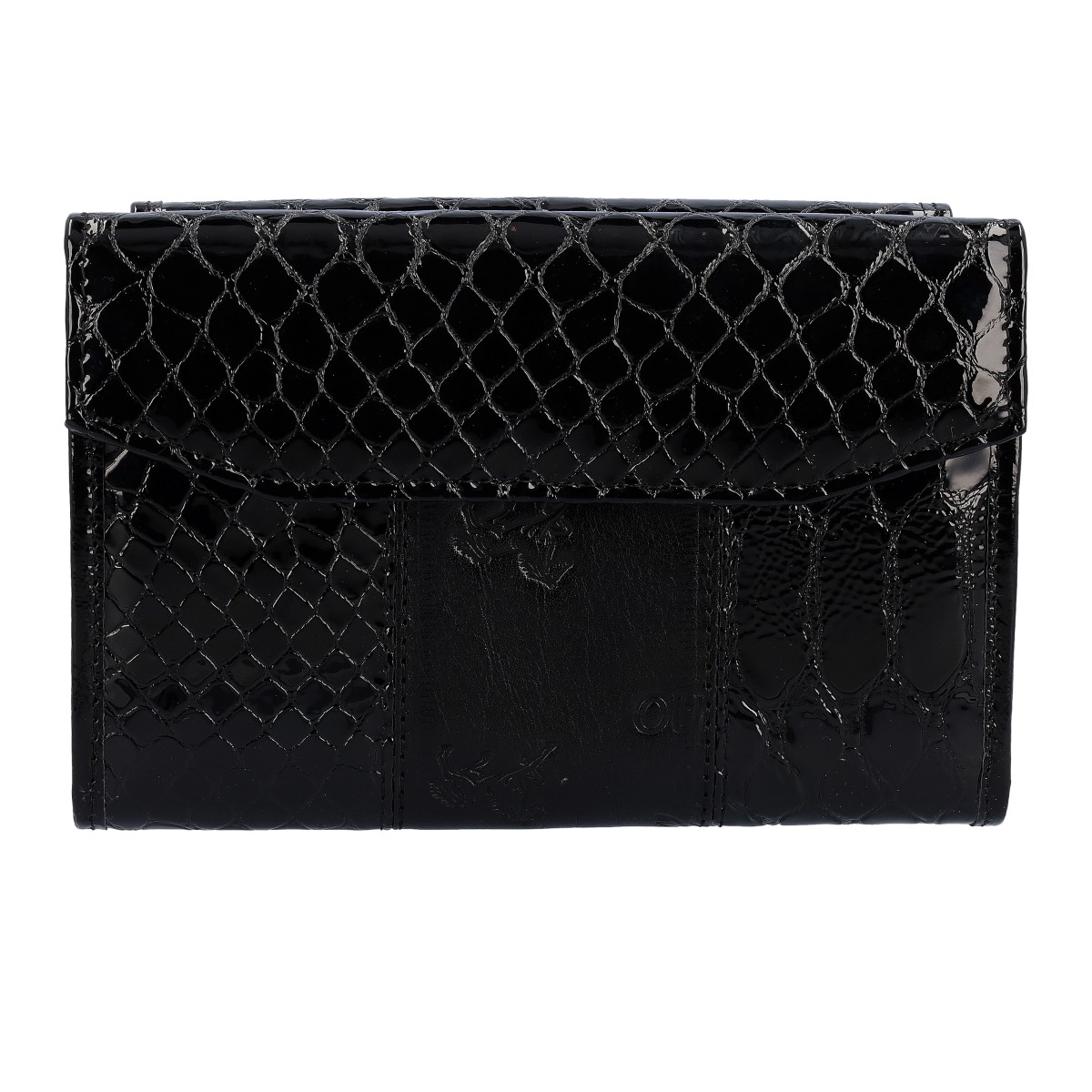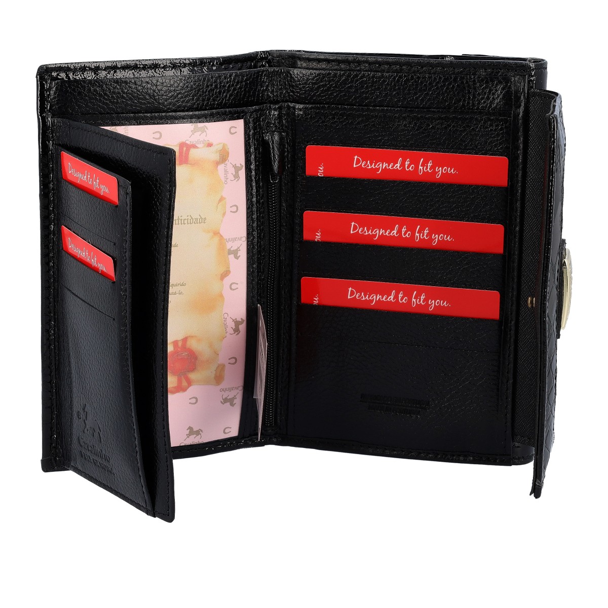 Carteira Cavalinho Honor 28190221 Preto. Carteira média de senhora com 2 divisórias com mola, uma para documentos e outra para moedas. Tem 11 espaços para cartões e 2 micas para colocar fotos. Tem 2 compartimentos para notas e/ou documentos, um fecho interior e um separador para cheques.