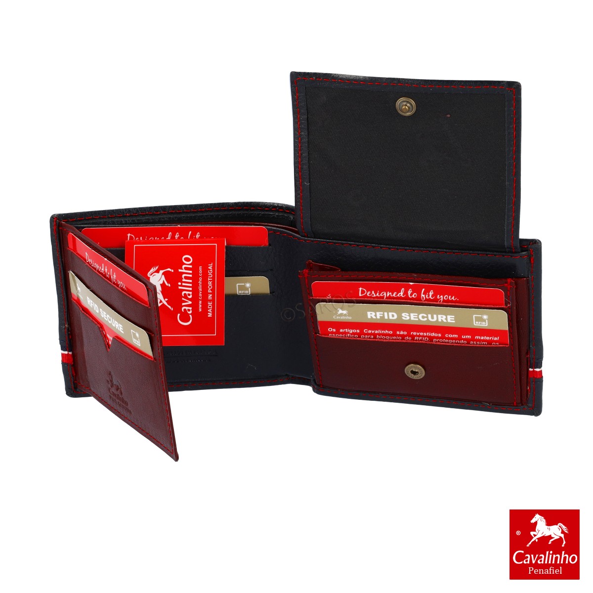 Carteira em pele com 9 ranhuras para cartões, 1 mica para fotos, moedeiro com mola e 2 separadores para notas.Com sistema RFID Secure que protege os seus cartões bancários.