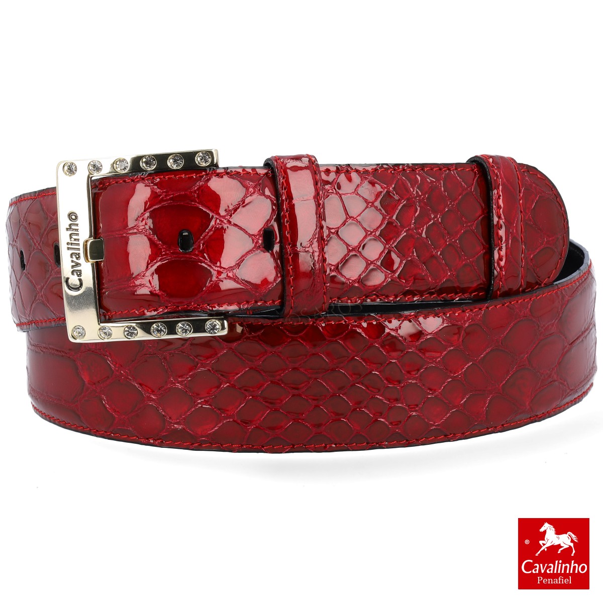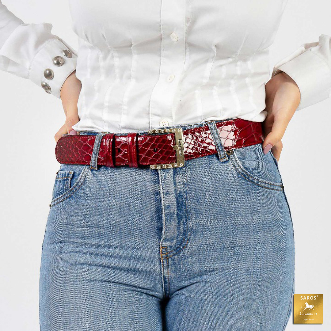 Cinto de senhora Cavalinho em pele "Croco" na cor vermelho. A belissima fivela com brilhantes realça a elegância e exclusividade. Materiais de elevada qualidade.