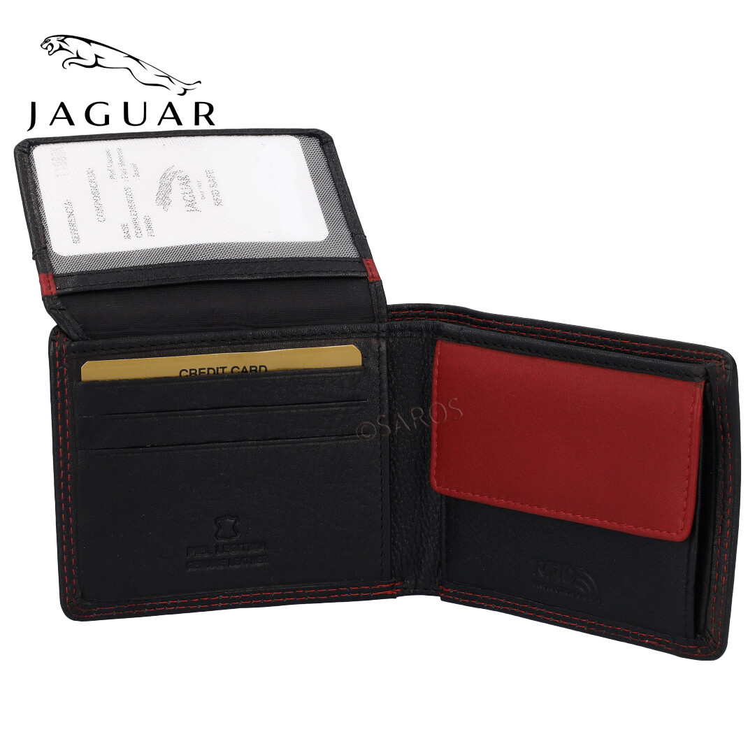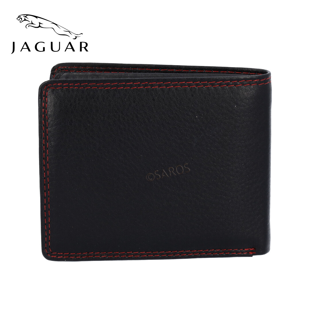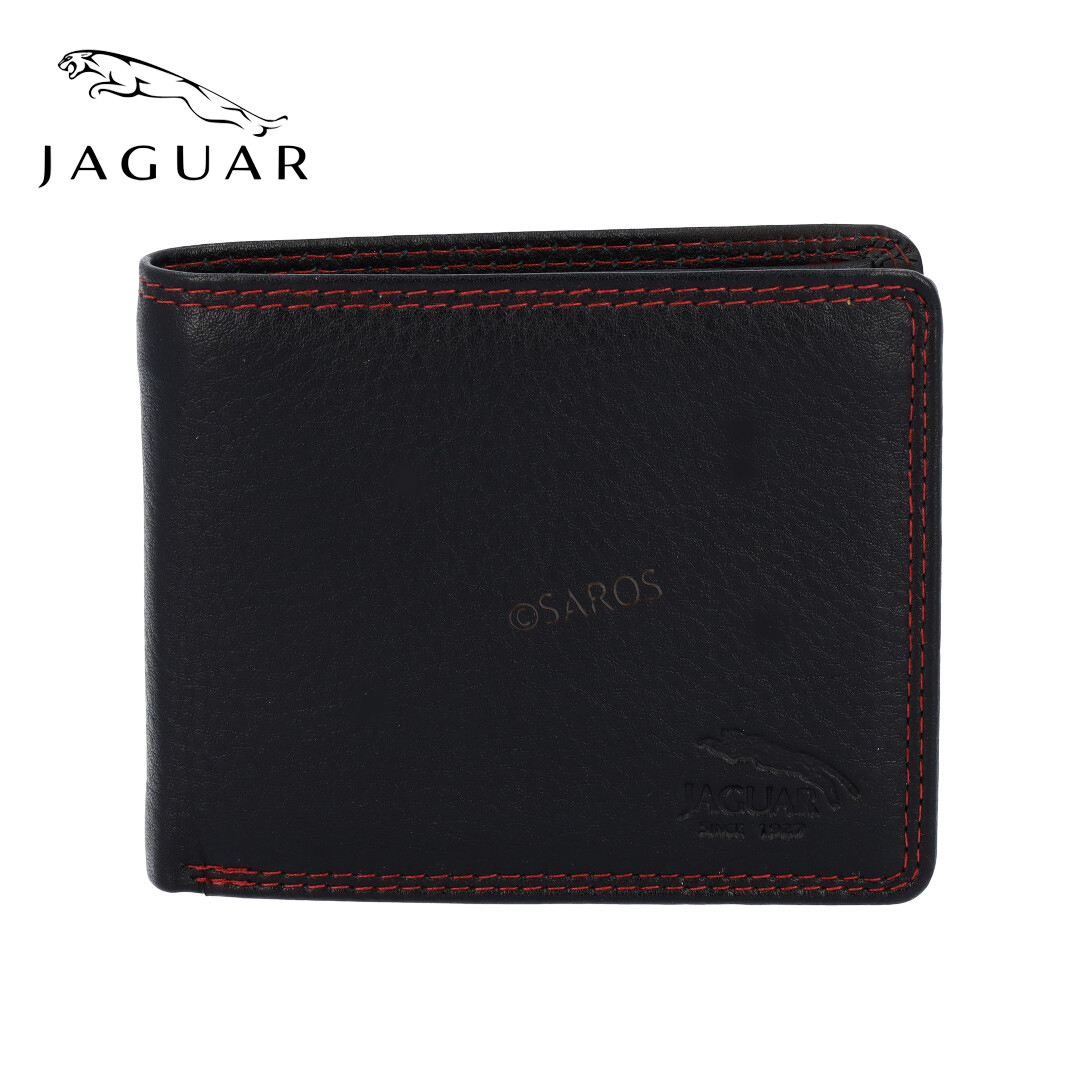 Carteira de Homem preta da  Jaguar . Tem 2 compartimentos para notas, 5 compartimentos para cartões, 2 compartimentos de rede, 2 compartimentos interiores escondidos, um porta-moedas e uma presilha interior a fechar com mola. Dimensões: L: 11 x A: 8,5 x P: 1,5 (cm)