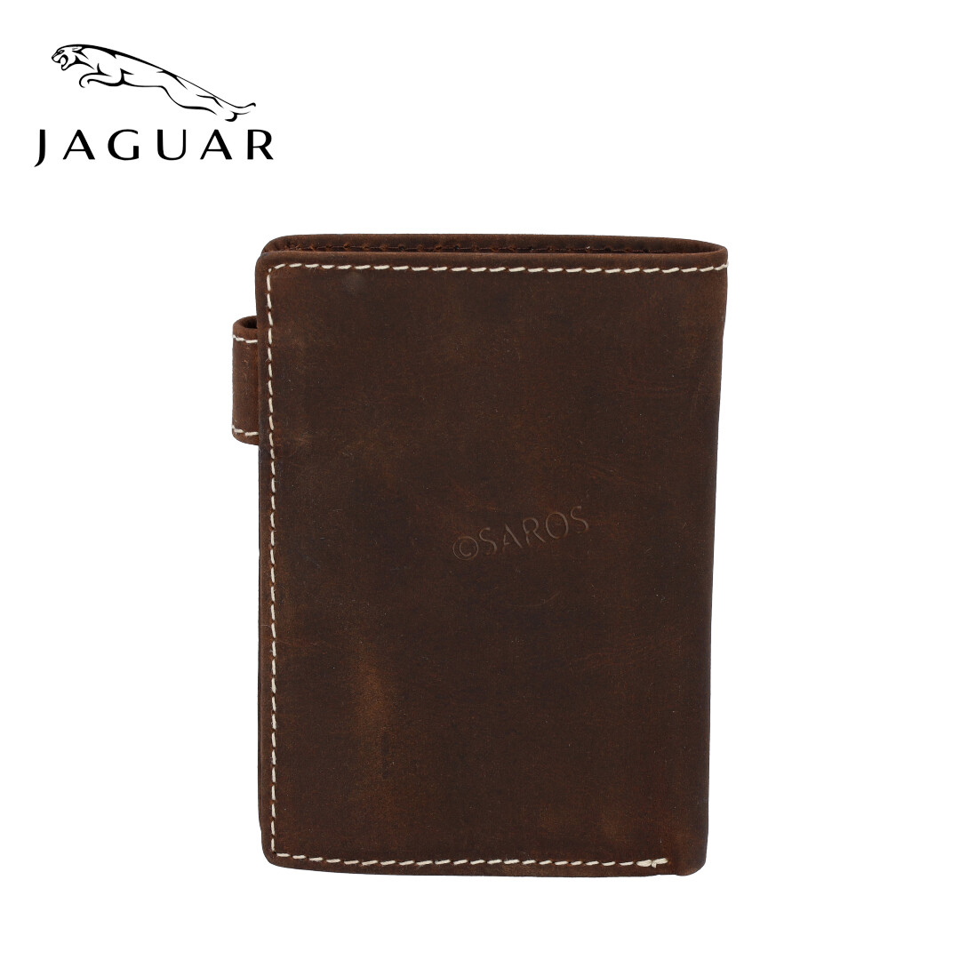 Carteira Jaguar para homem em pele macia e leve, no tom de castanho. Carteira para capacidade de 4 cartões em divisórias separadas e 1 divisória para as notas e outra para moedas.