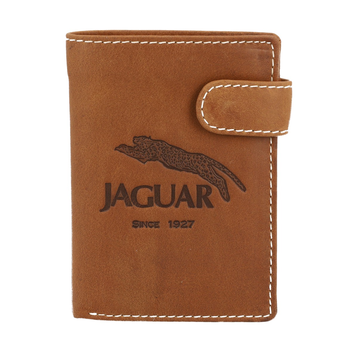 Carteira Jaguar para homem em pele macia e leve, no tom de castanho. Carteira para capacidade de 4 cartões em divisórias separadas e 1 divisória para as notas e outra para moedas.