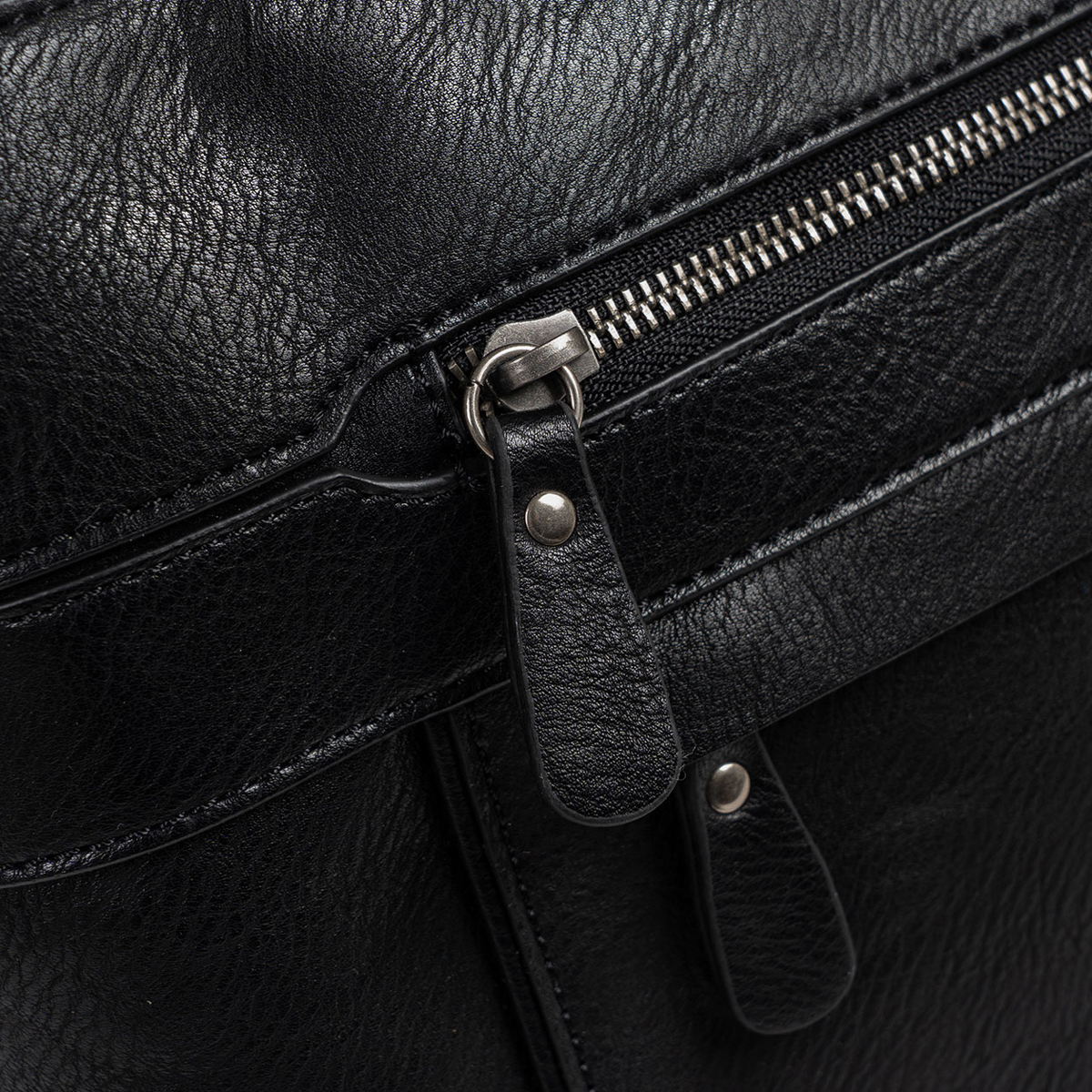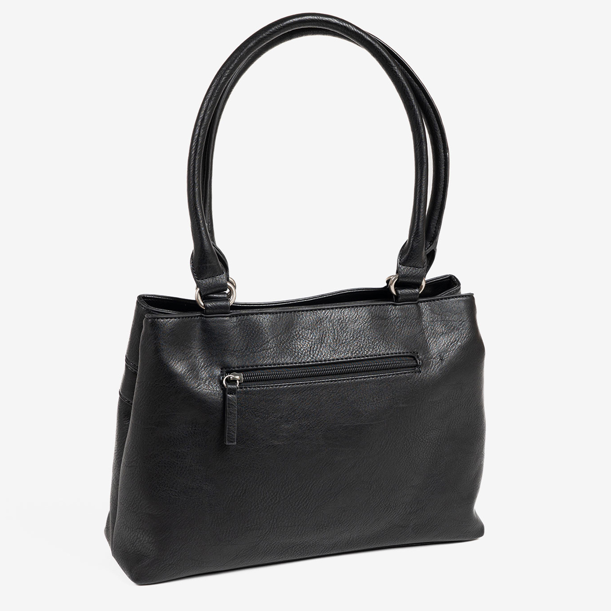 Bolsa de ombro, modelo clássico para mulher, nos tons de preto. Fabricada com materiais de couro sintético de alta qualidade. Bolsa tem uma divisória principal com o fecho em zíper, 2 compartimentos na frente e um na parte de trás,  Possui ainda duas alças para o ombro.