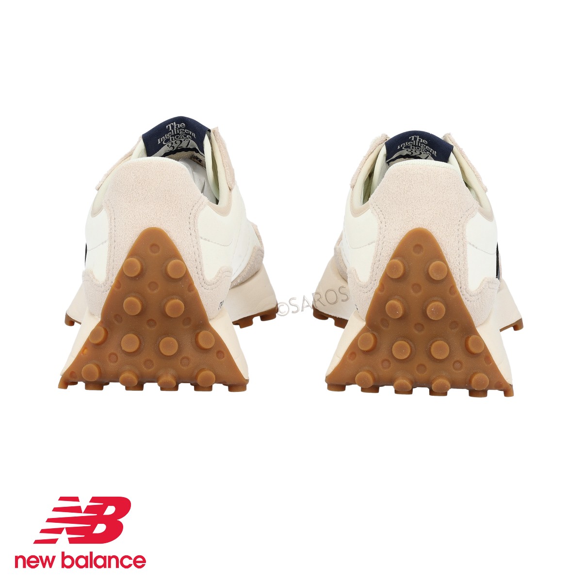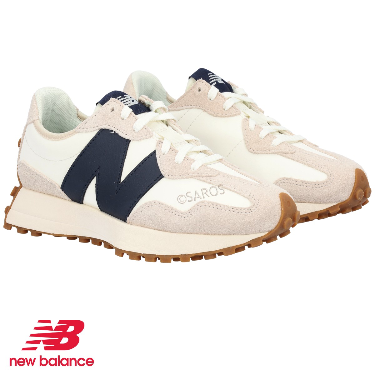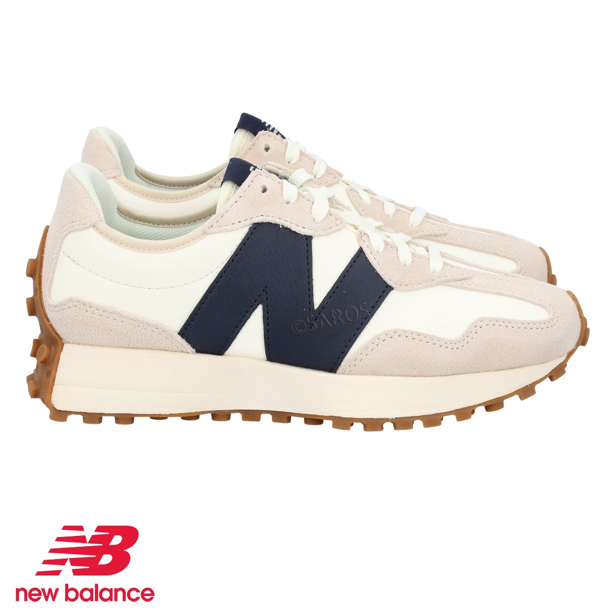 O modelo 327 é caracterizado pelo "N" sobredimensionado em azul e a sola branca com os famosos mini "pitons", que sobem até à parte traseira, em camel.