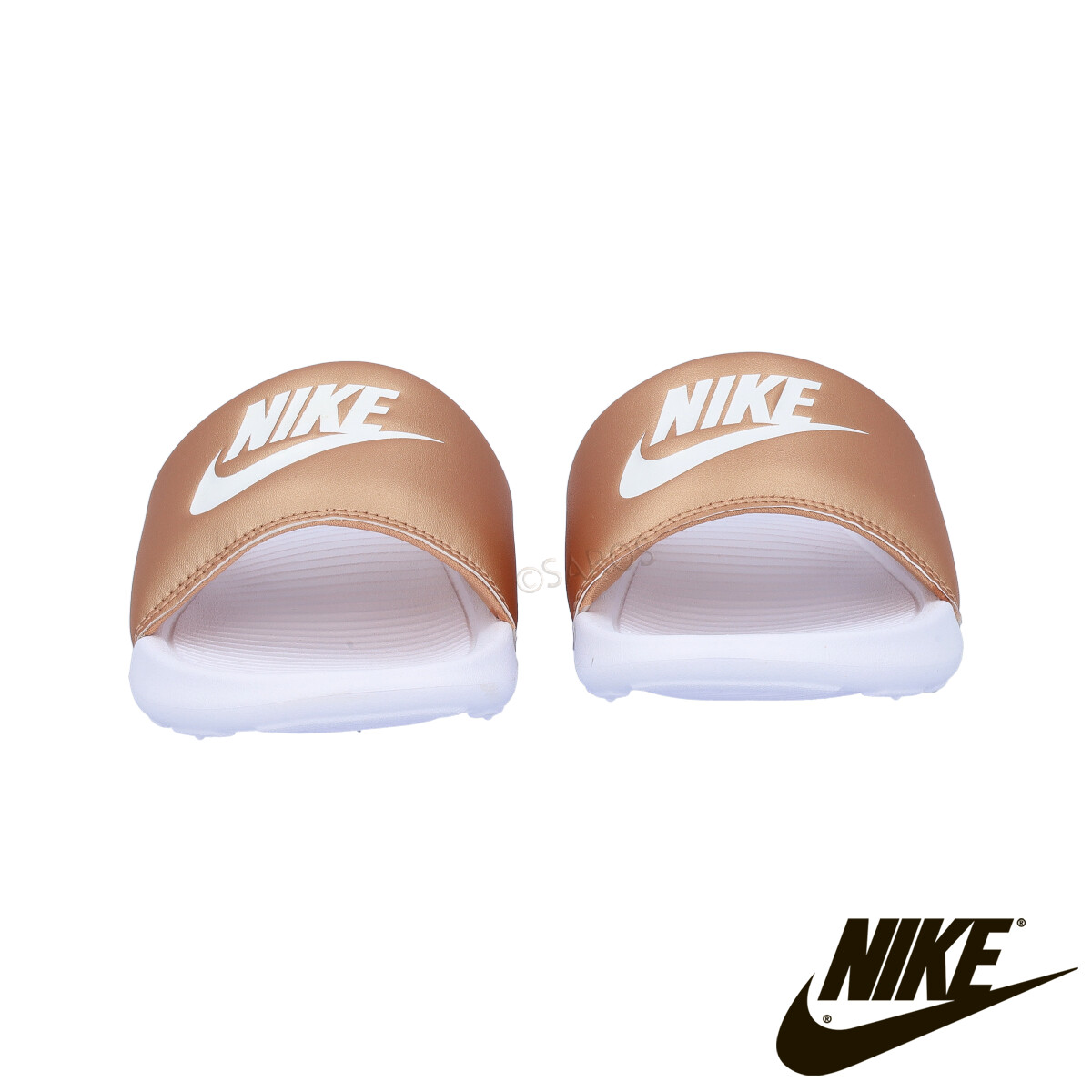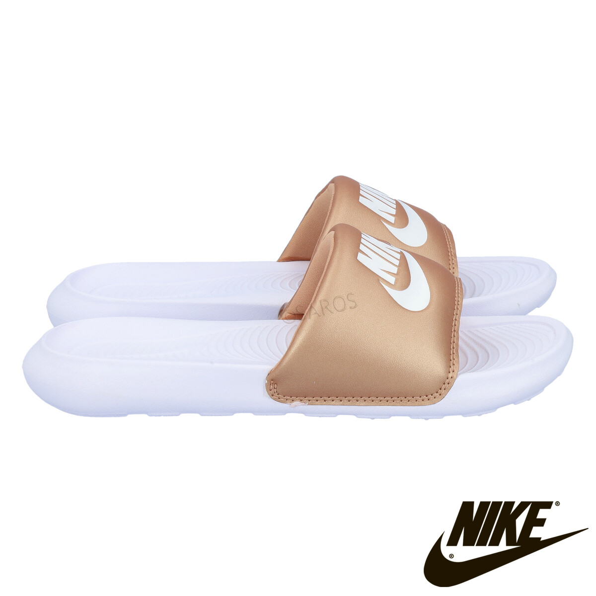 Chinelos da Nike para Mulher na cor Ouro. Modelo Nike Victori One Slide em branco com Ouro e logotipo em branco na parte superior do chinelo. Surpreende pela sua leveza e pelas palmilhas moldadas.