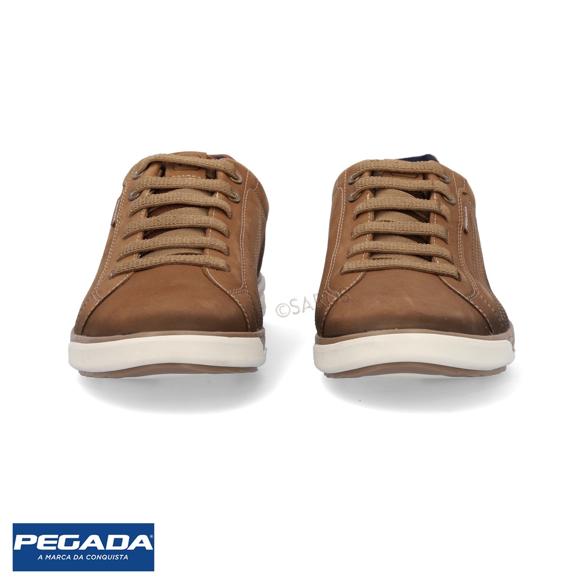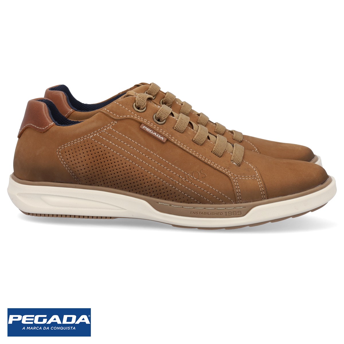 Sapatilhas Pegada em couro camel de alta qualidade, resistência e durabilidade. Fáceis de calçar com cordões elásticos. Palmilha macia e com Tecnologia AMORTECH BLUE MEMORY FOAM, que se adapta aos contornos dos pés e volta ao formato original, material que garante ainda menos impactos na pisada. Sola antiderrapante e de alta flexibilidade.