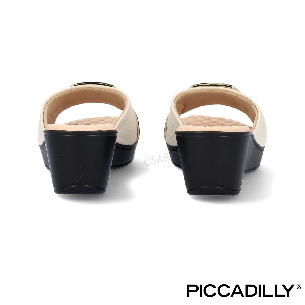 Chinelos de cunha Piccadilly em preto e branco, com aplicações metálicas em dourado. Forro e acabamentos macios, essencial para quem precisa ficar horas de pé no trabalho.