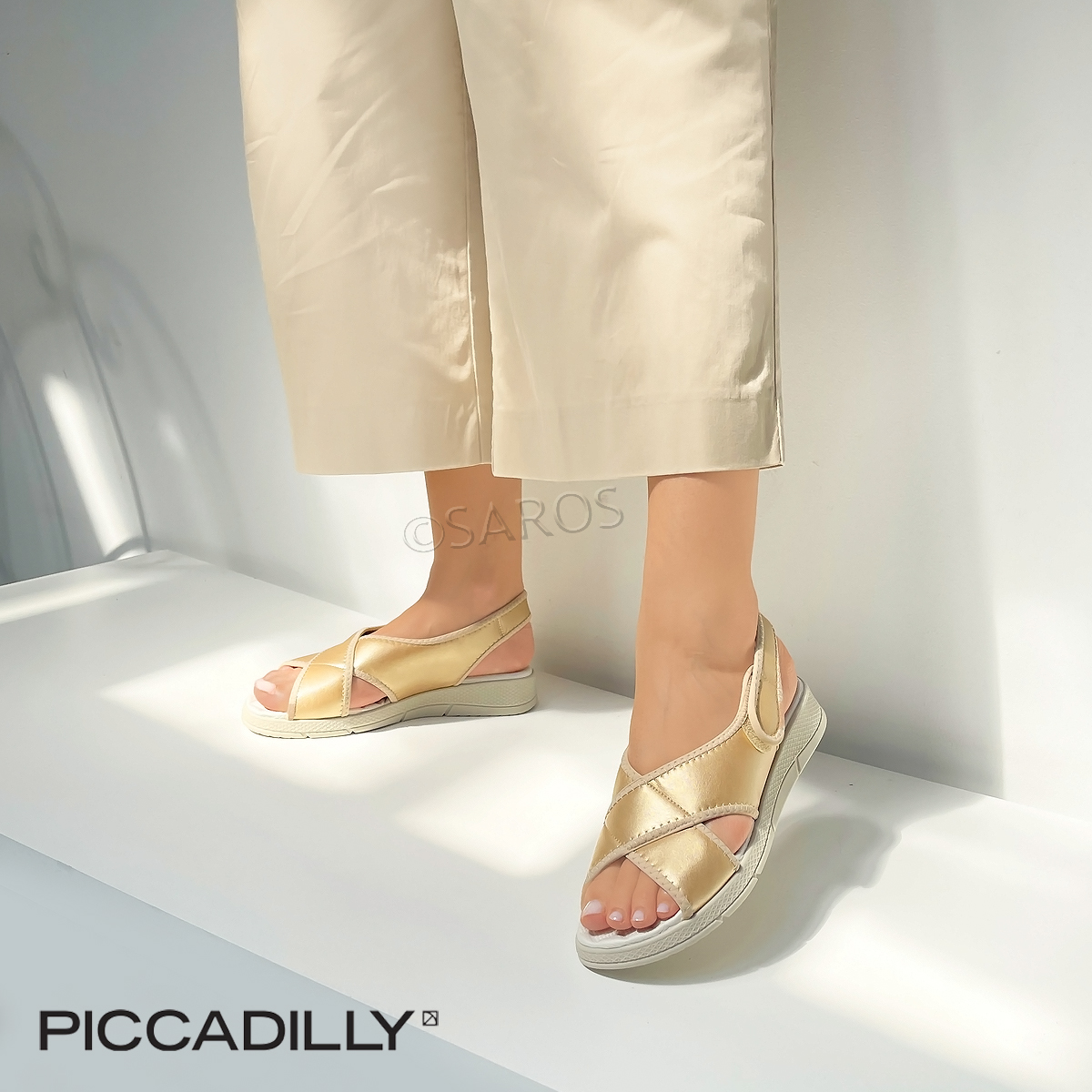 Sandália desportiva Piccadilly em dourado. Este modelo tem palmilha anatómica com contorno especial que previne a pressão na região central do calcanhar. Produzido com materiais macios e muito flexíveis para que se adaptem ao pé sem pressão. Tecnologia WIDE FIT.