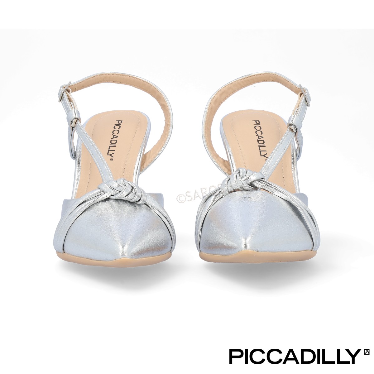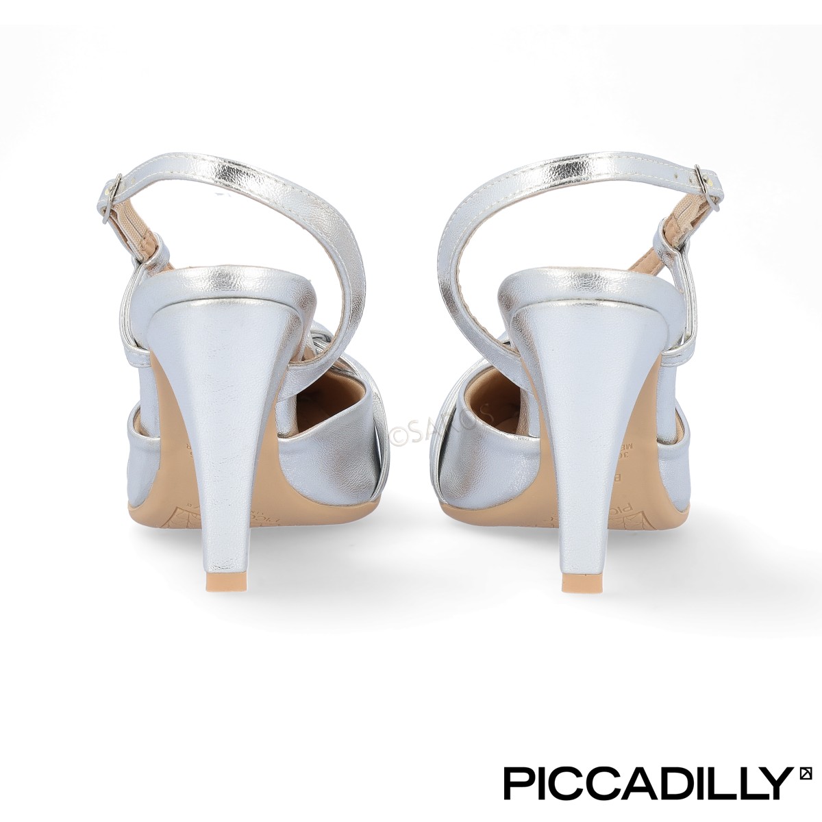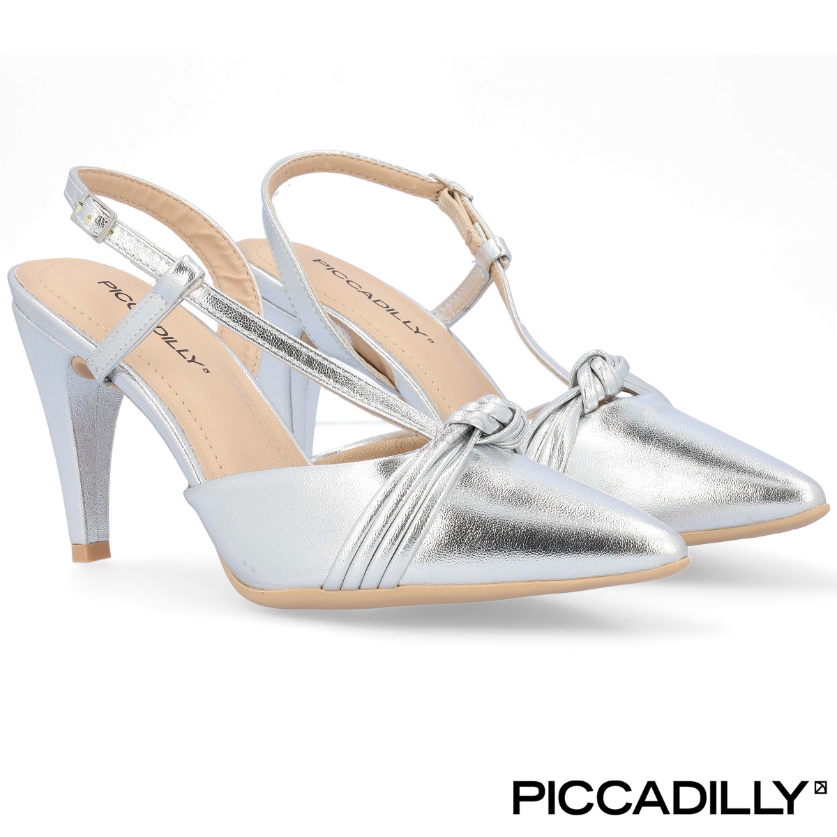 Sandálias de salto alto Piccadilly em prateado, com frente fechada e detalhes de requinte. Para além da elegância, este modelo também oferece o conforto que precisa para brilhar em todas as festas.