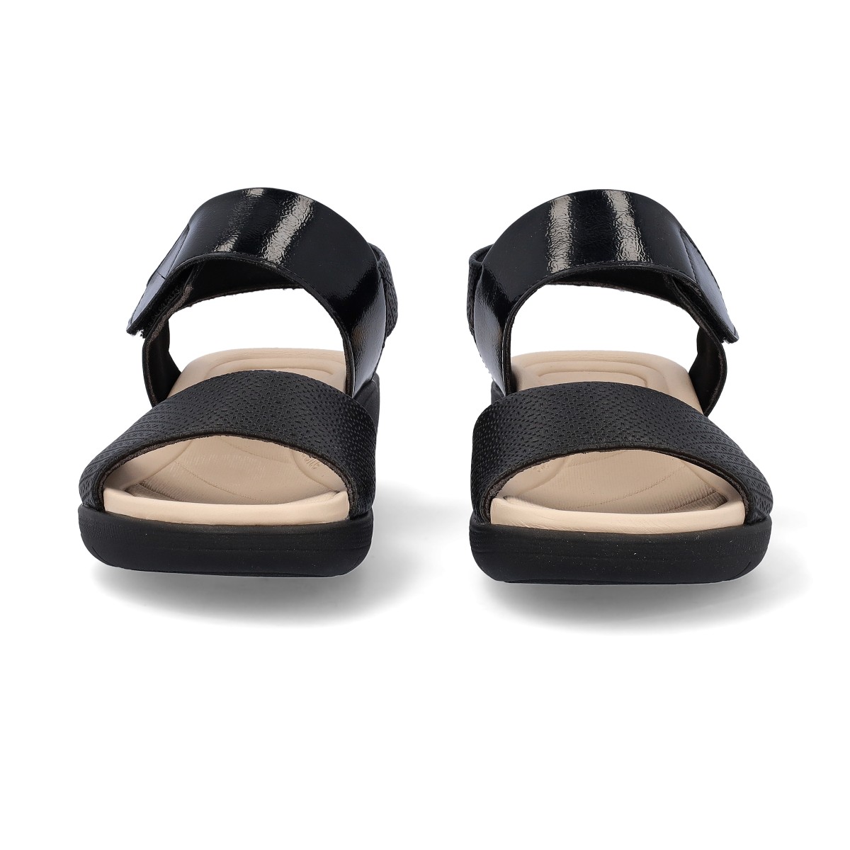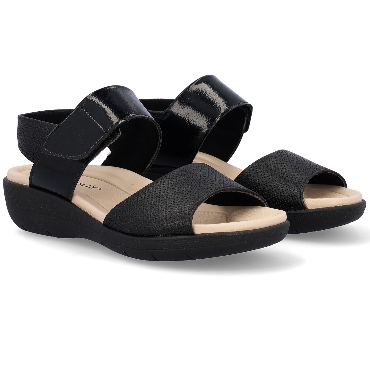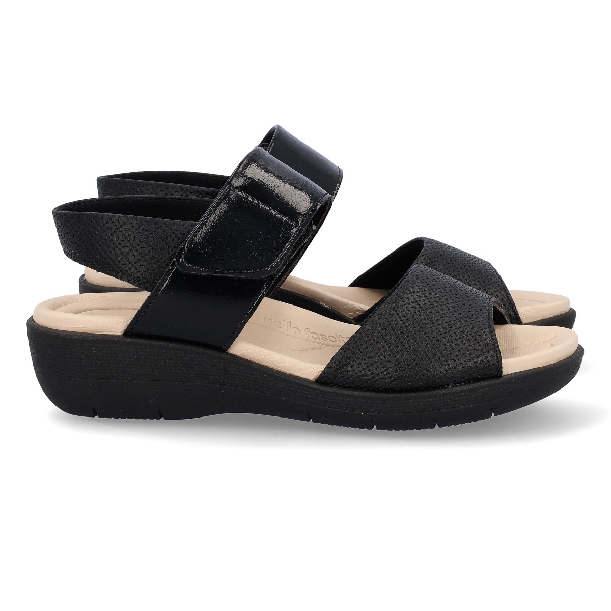 Sandálias de senhora fáceis de calçar, com tira de velcro no tornozelo. Palmilha anatómica para maior absorção de impactos e consequentemente maior conforto. Cunha baixa de 4cm.
