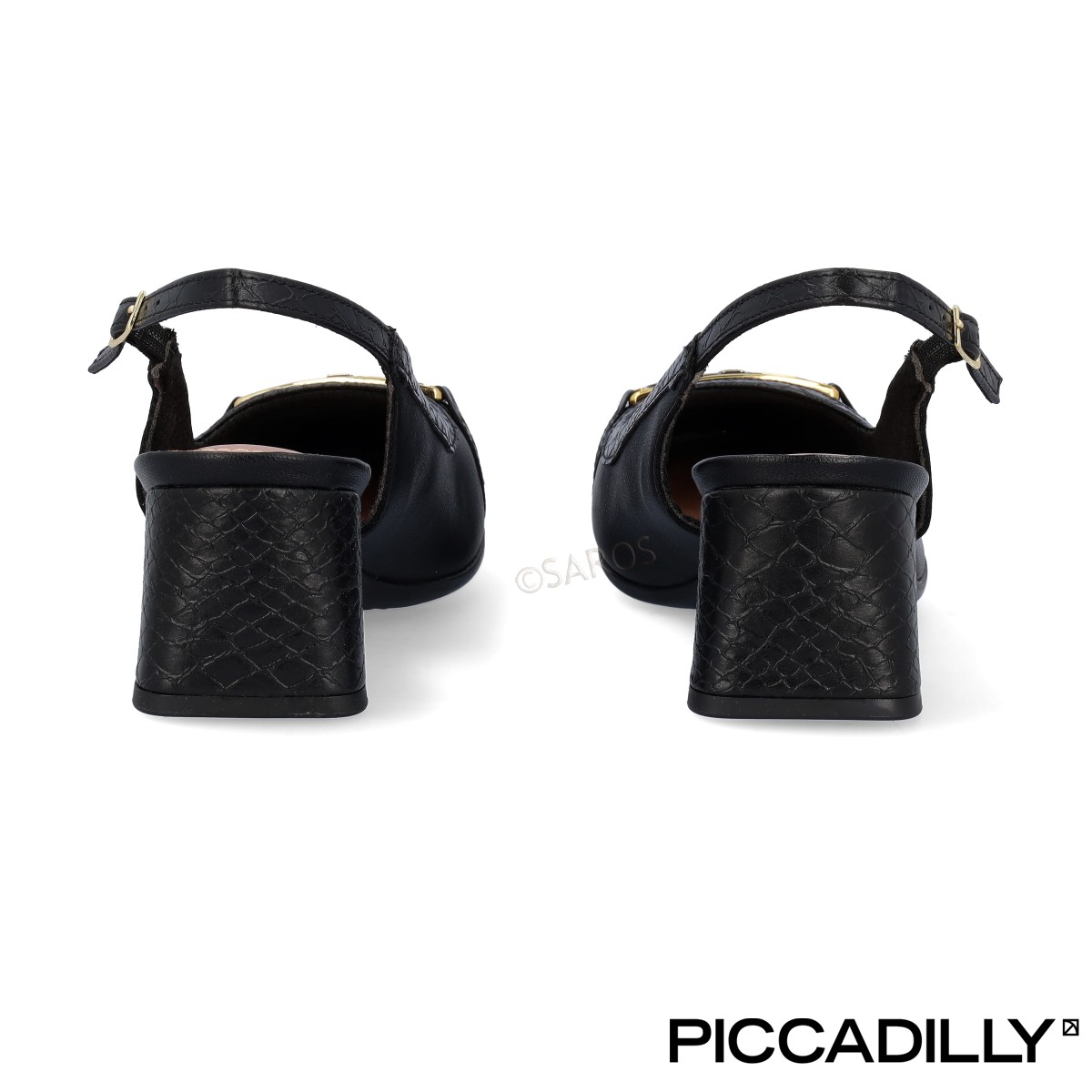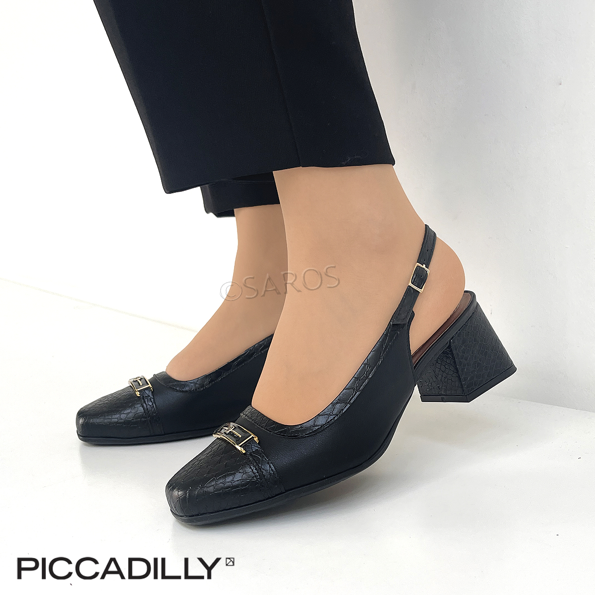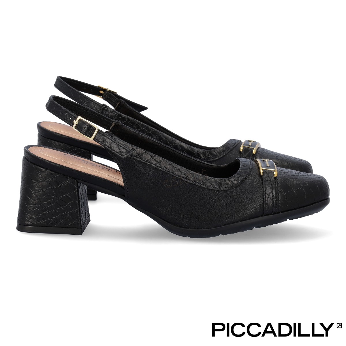 Sapatos Piccadilly em preto, abertos no calcanhar (Slingback).  PICCADILLY MAXI com tecnologia WIDE FIT, (formas com medidas especiais para não pressionarem o pé). Adaptam-se ao formato dos pés, garantindo estabilidade e bem-estar.