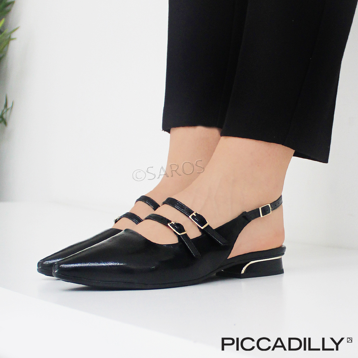 Sapatos elegantes e rasos da Piccadilly, modelo Sling Back. A tendência das fivelas Mary Jane chegou aos sapatos abertos no calcanhar. A prova como não precisa de salto alto para fica elegante! Experimente!