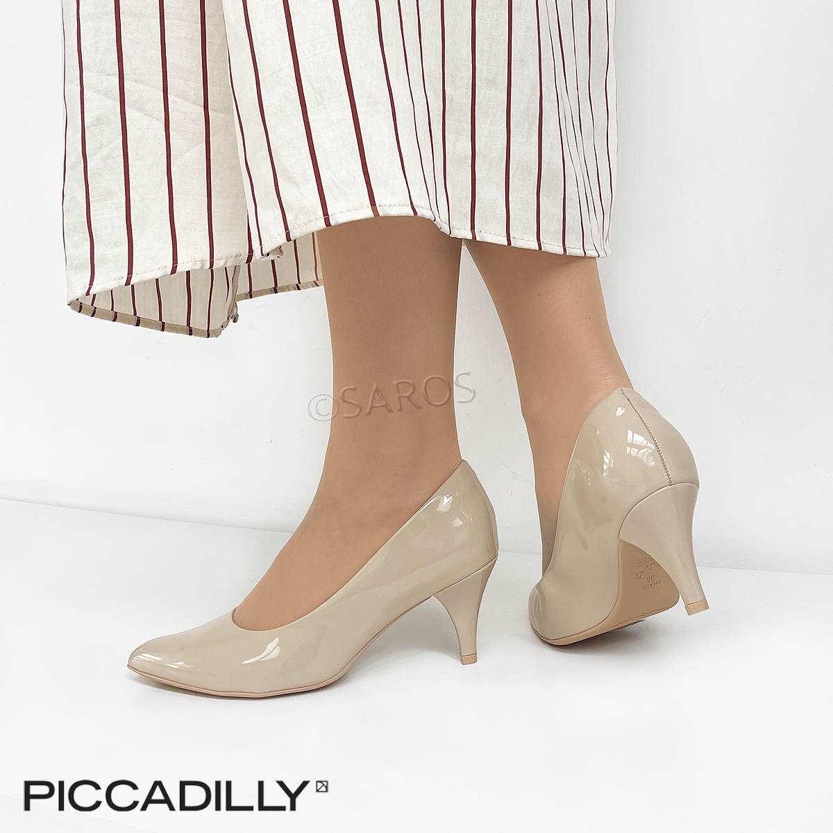 Sapatos Stilettos Piccadilly em verniz bege, de salto médio fino (6.5cm). Uns sapatos leves e flexíveis que nos dão um máximo de conforto e uma beleza incrível.