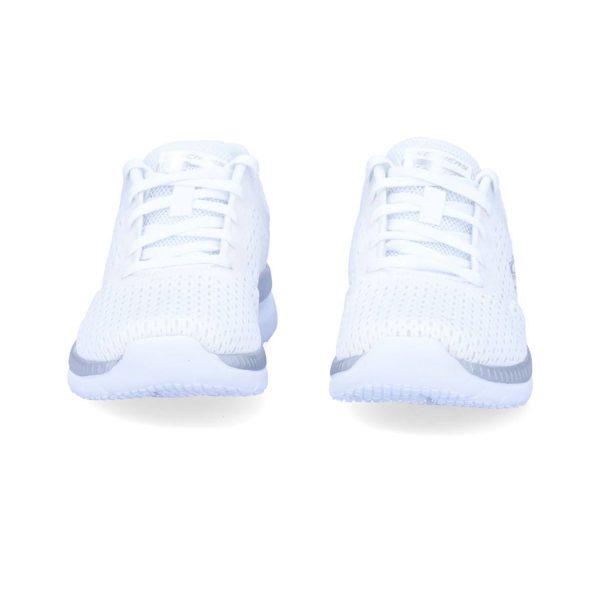 Sapatilhas Skechers de senhora no modelo Bountiful Quick Path em branco. Um modelo com elevada flexibilidade e amortecimento que poderá usar tanto para a prática de exercício físico como para o dia-a-dia.