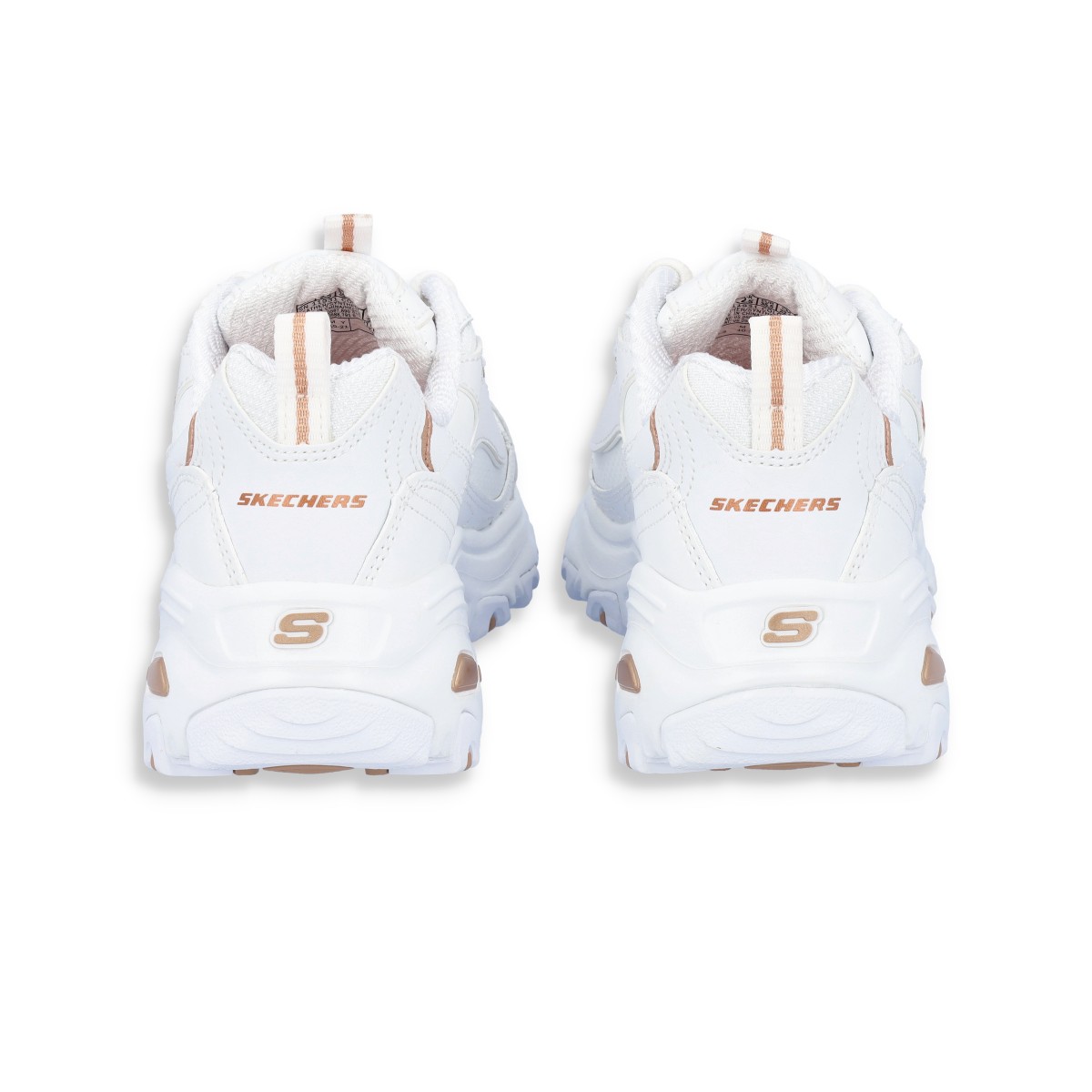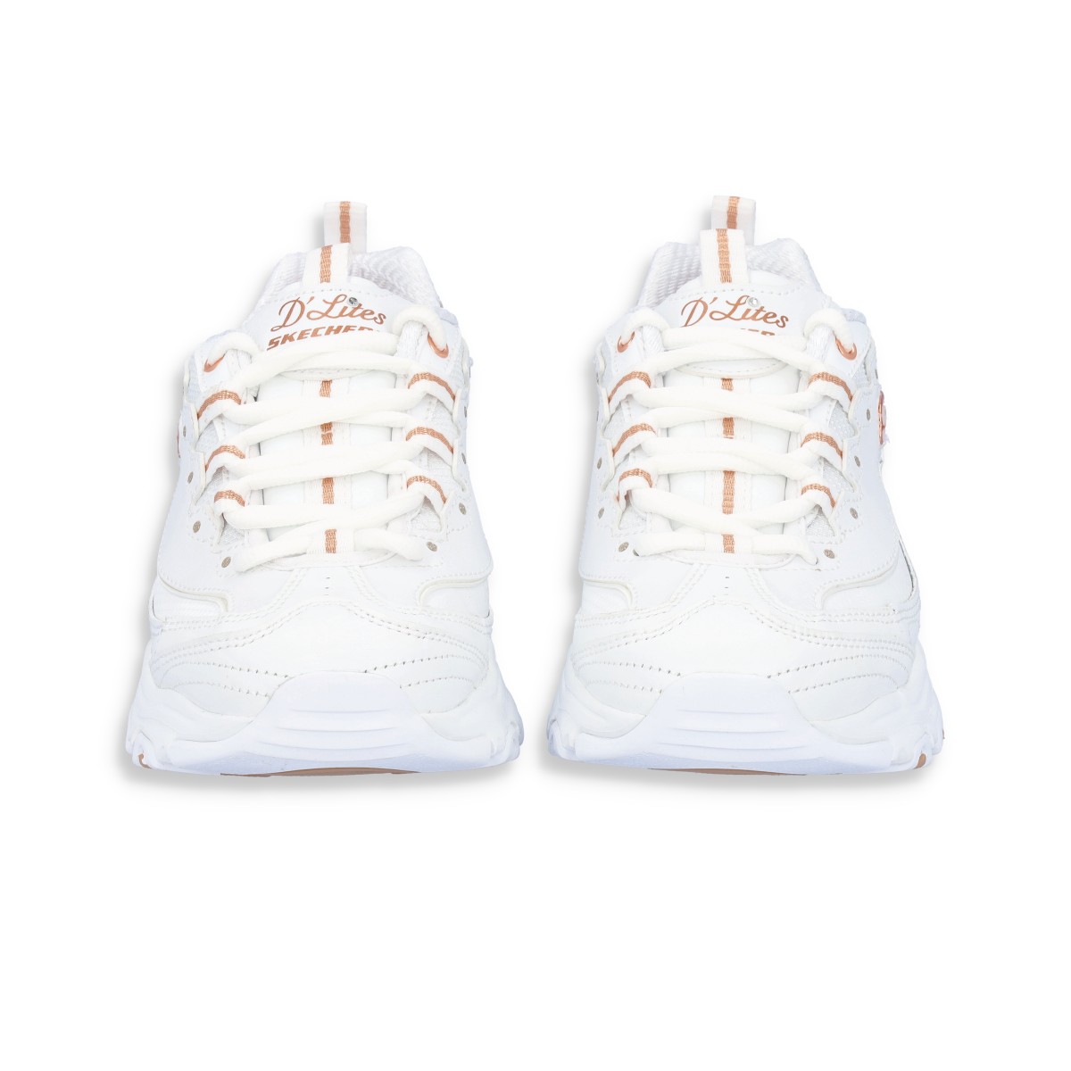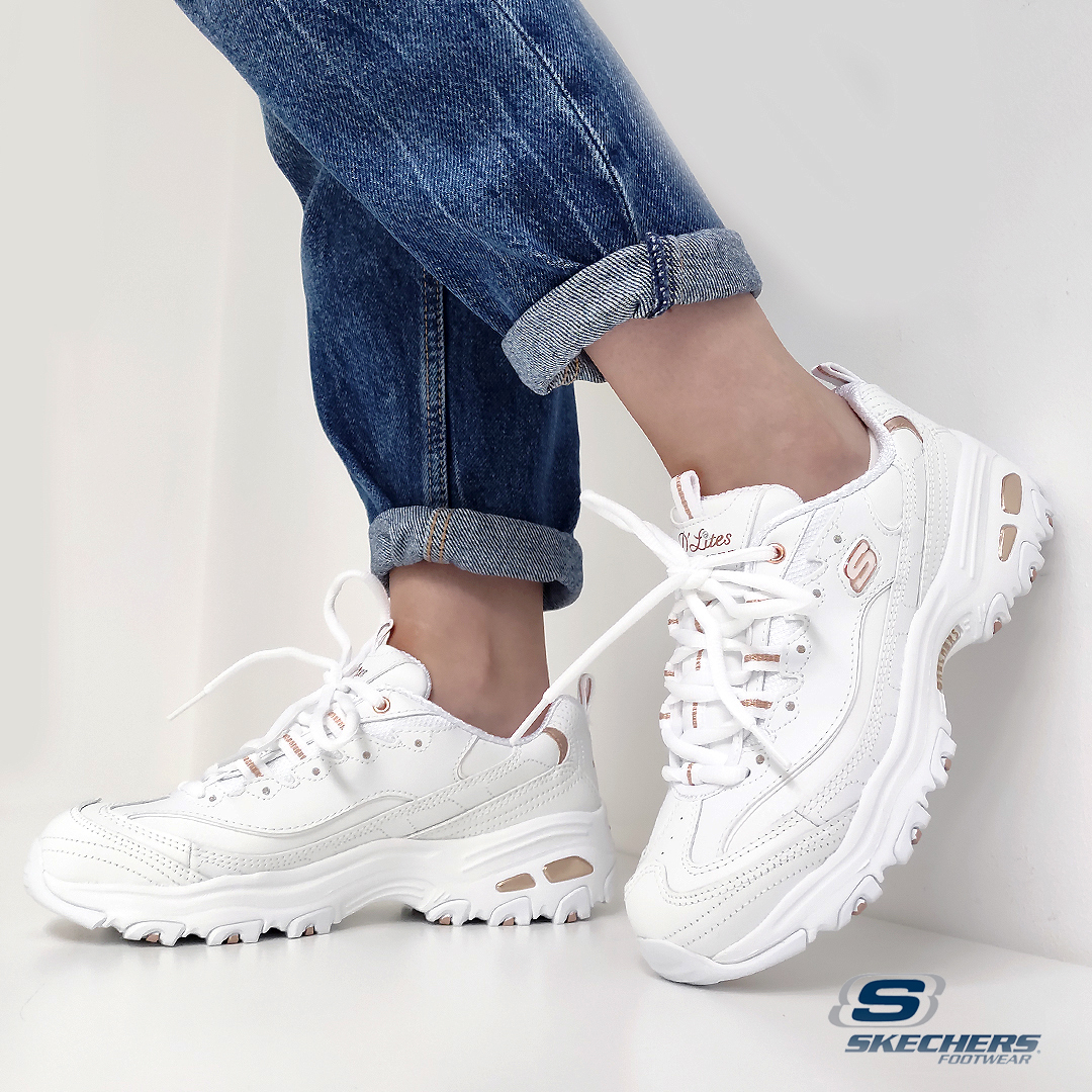 Sapatilhas Skechers D'Lites em branco com pormenores dourados. São um modelo fantástico em design e conforto. O seu estilo único encanta todas as gerações. Entressola leve com absorção de impactos e palmilha de conforto Air-Cooled Memory Foam.