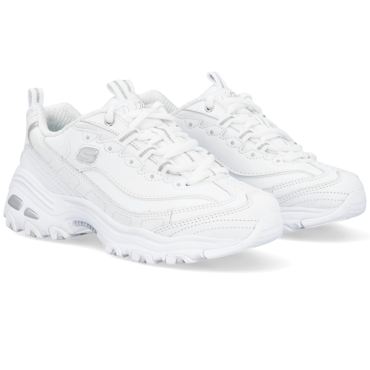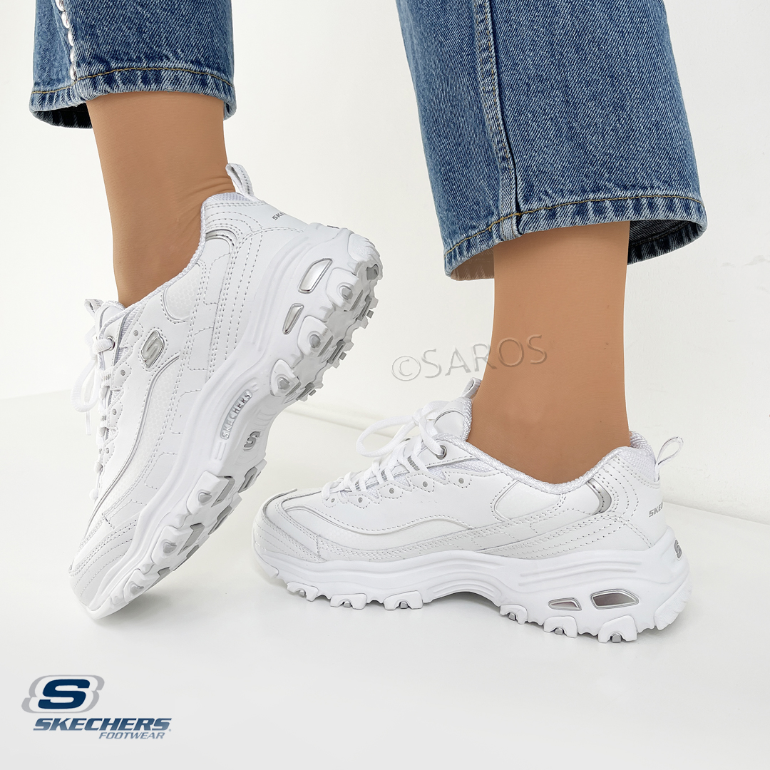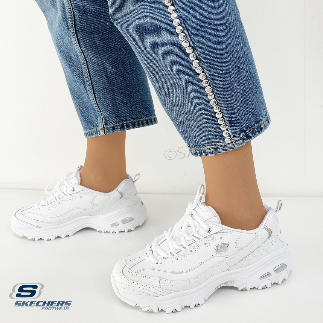Sapatilhas Skechers D'Lites em branco com pormenores prateados. Estes ténis Skechers D'Lites encantam todas as gerações com o seu estilo único. São um modelo fantástico em design e conforto. Entressola leve com absorção de impactos e palmilha de conforto Air-Cooled Memory Foam.