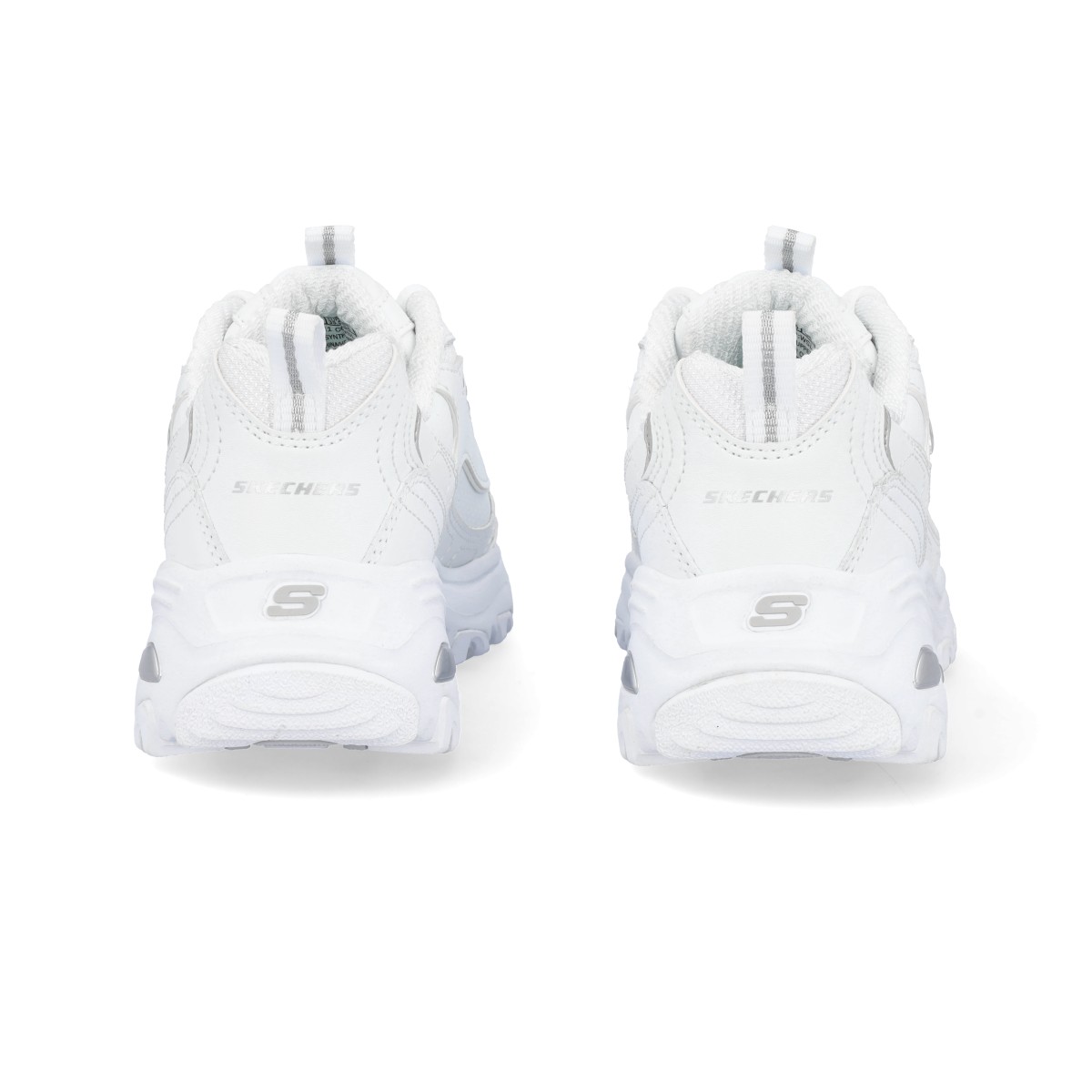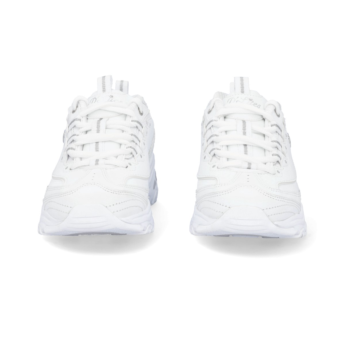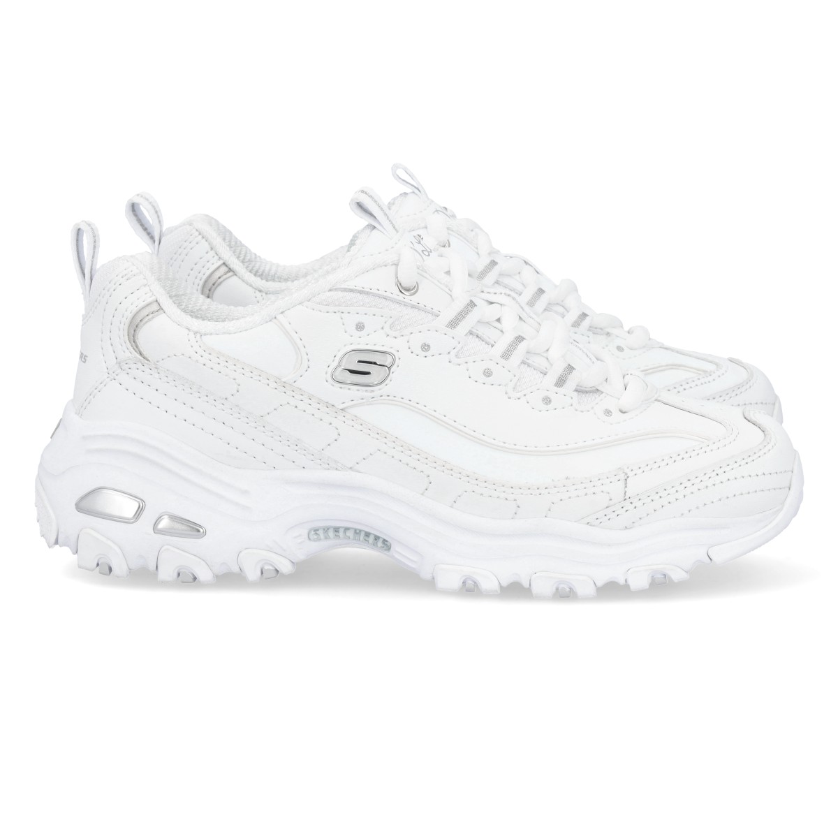 Sapatilhas Skechers D'Lites em branco com pormenores prateados. Estes ténis Skechers D'Lites encantam todas as gerações com o seu estilo único. São um modelo fantástico em design e conforto. Entressola leve com absorção de impactos e palmilha de conforto Air-Cooled Memory Foam.